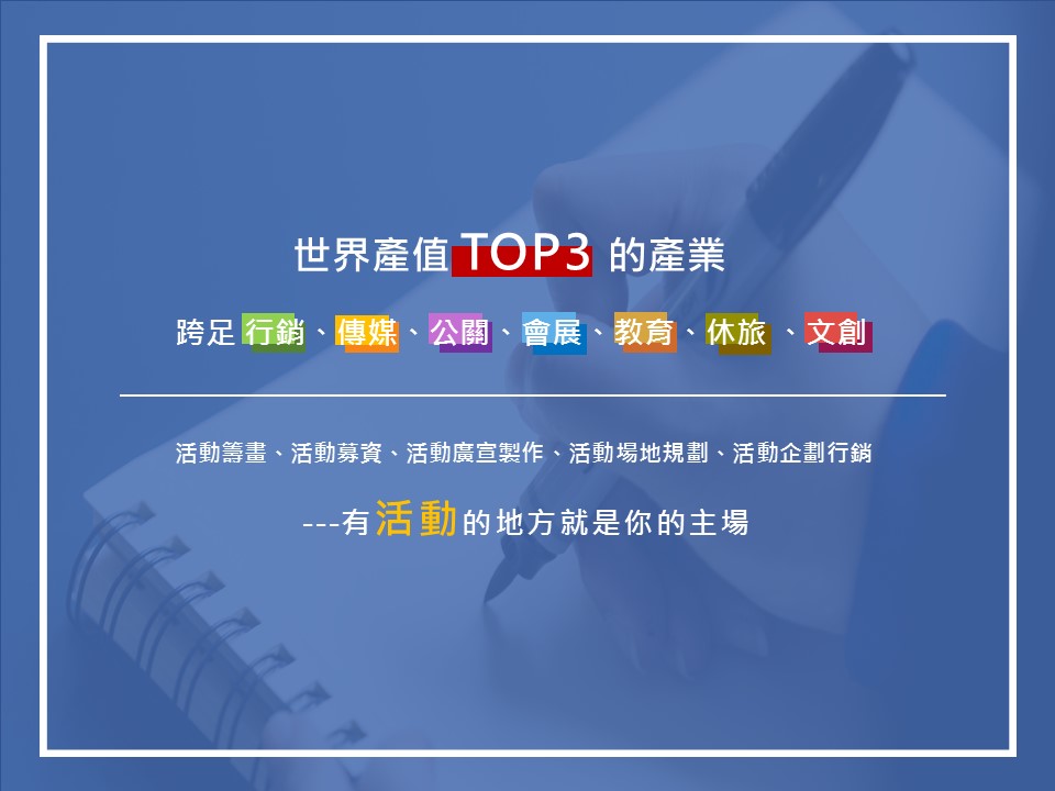 | 【可進入】:公關、行銷、媒體、會展、教育培訓、文化創意、休閒觀光、服務…等廣大活動產業! |