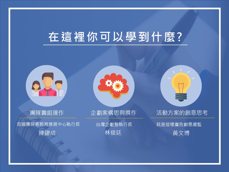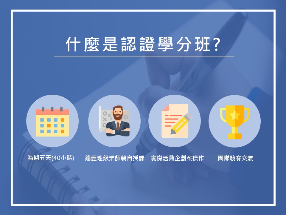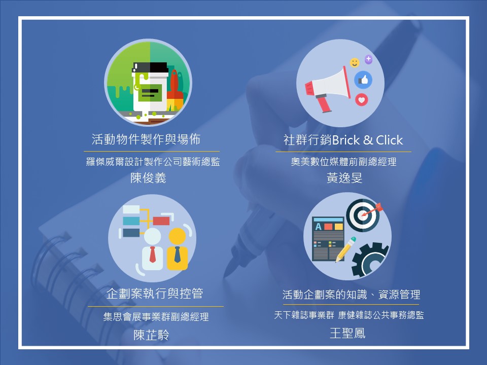 | 集合奧美公關、精英公關、摩奇創意、集思國際會展等,最專業的頂尖講師,40小時的互動實戰式企劃培訓。 |