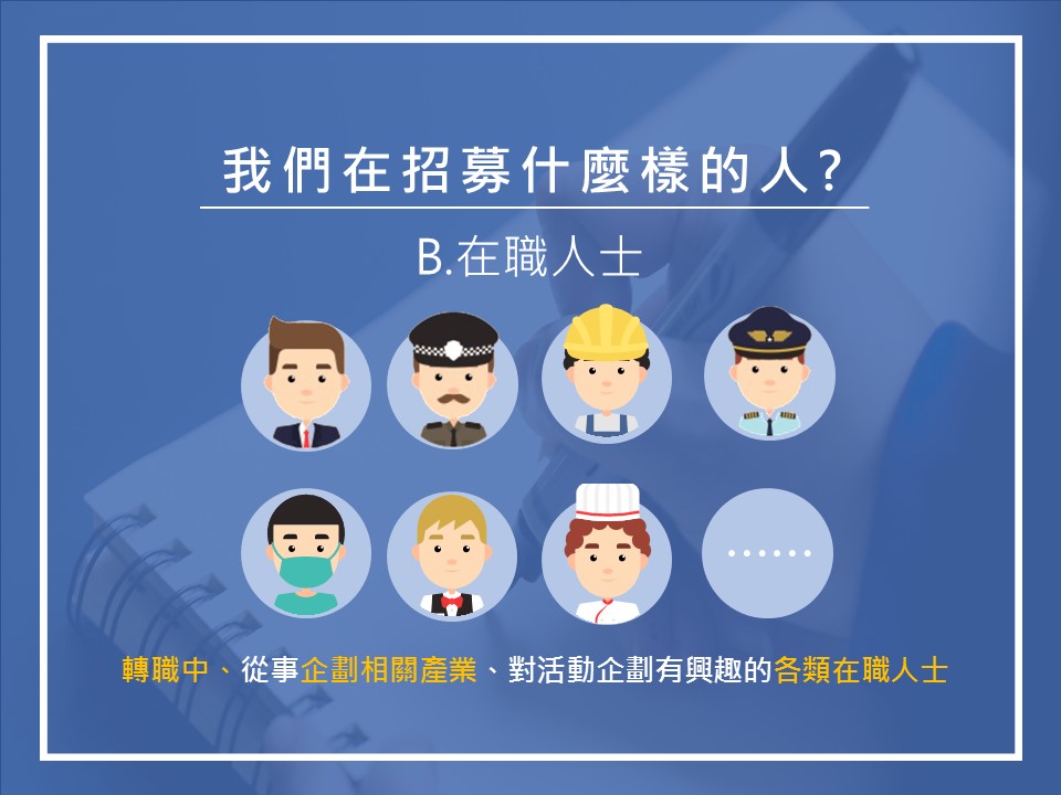 | 【用得上】:「活動企劃」專業職能,跨領域、跨行業、跨組織、跨職位…,具廣泛職缺需求、用得上! |