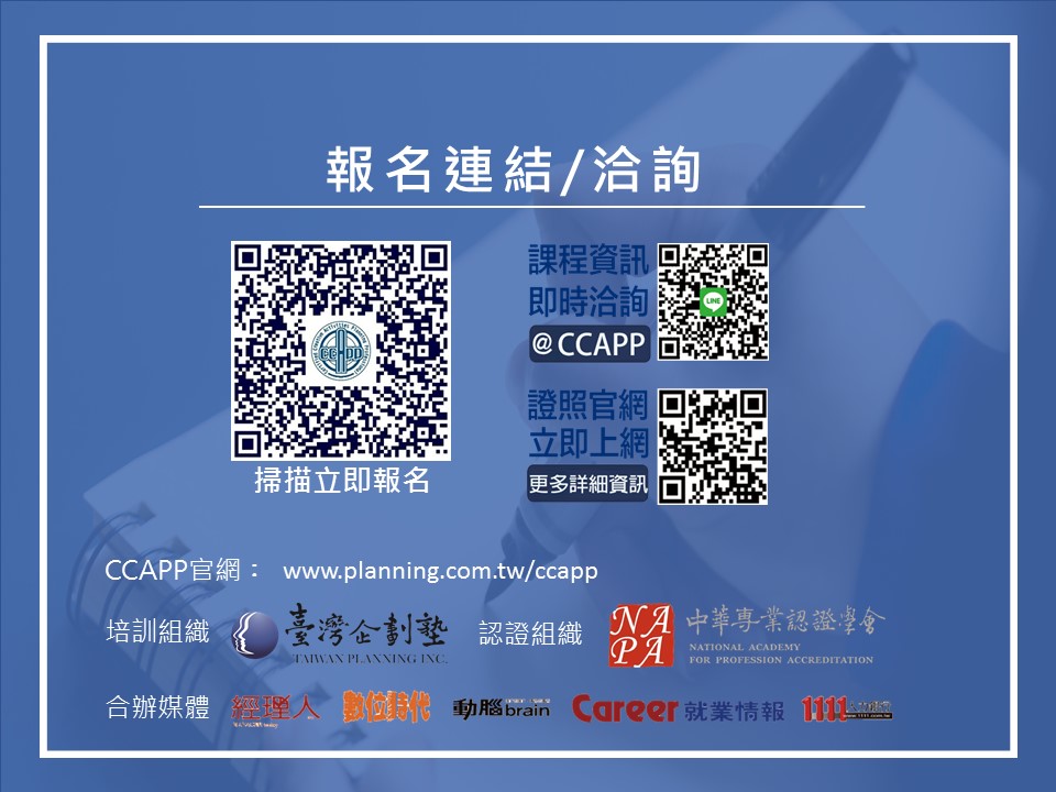 | 課程諮詢 02-23650930 ccapp@planning.com.tw |
