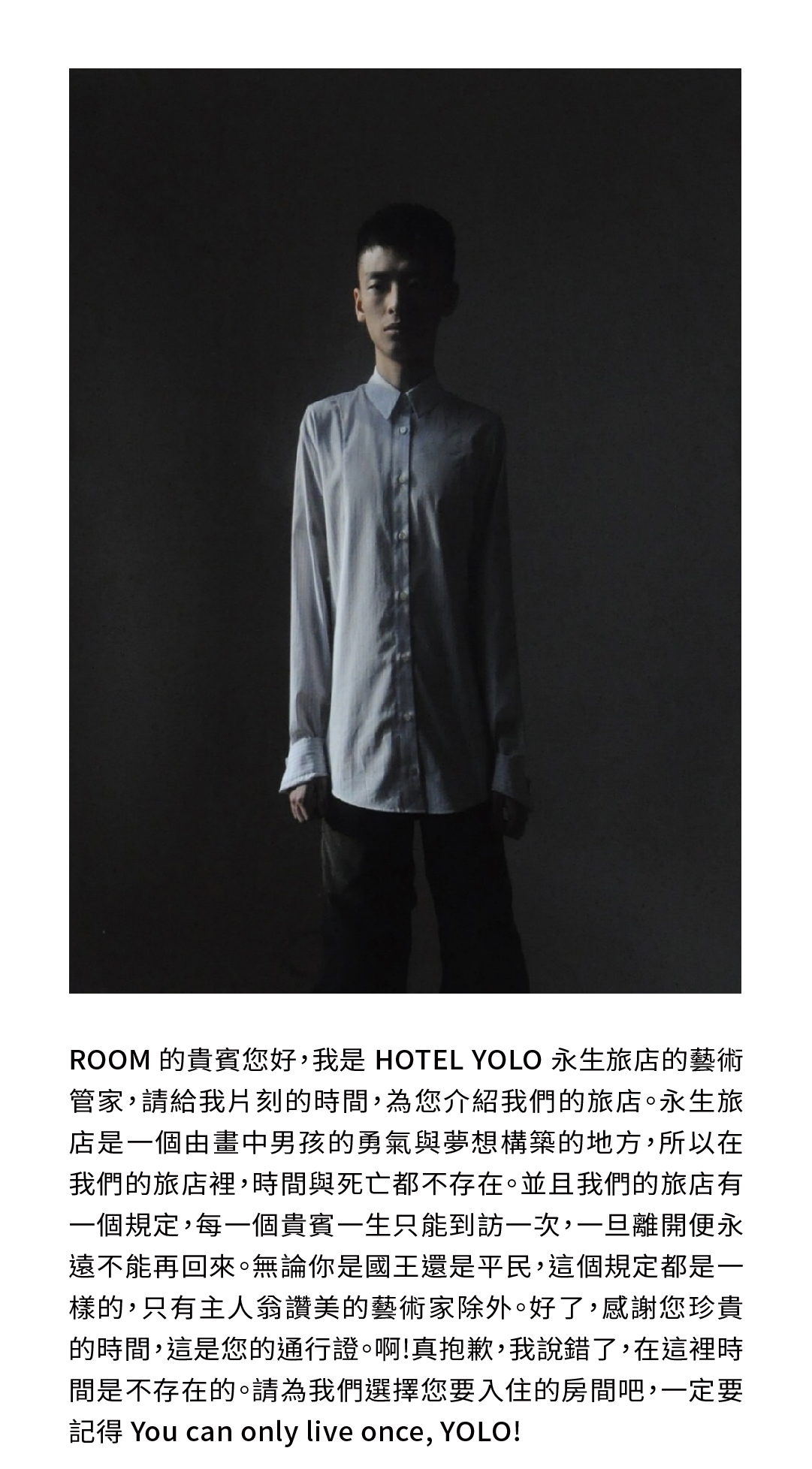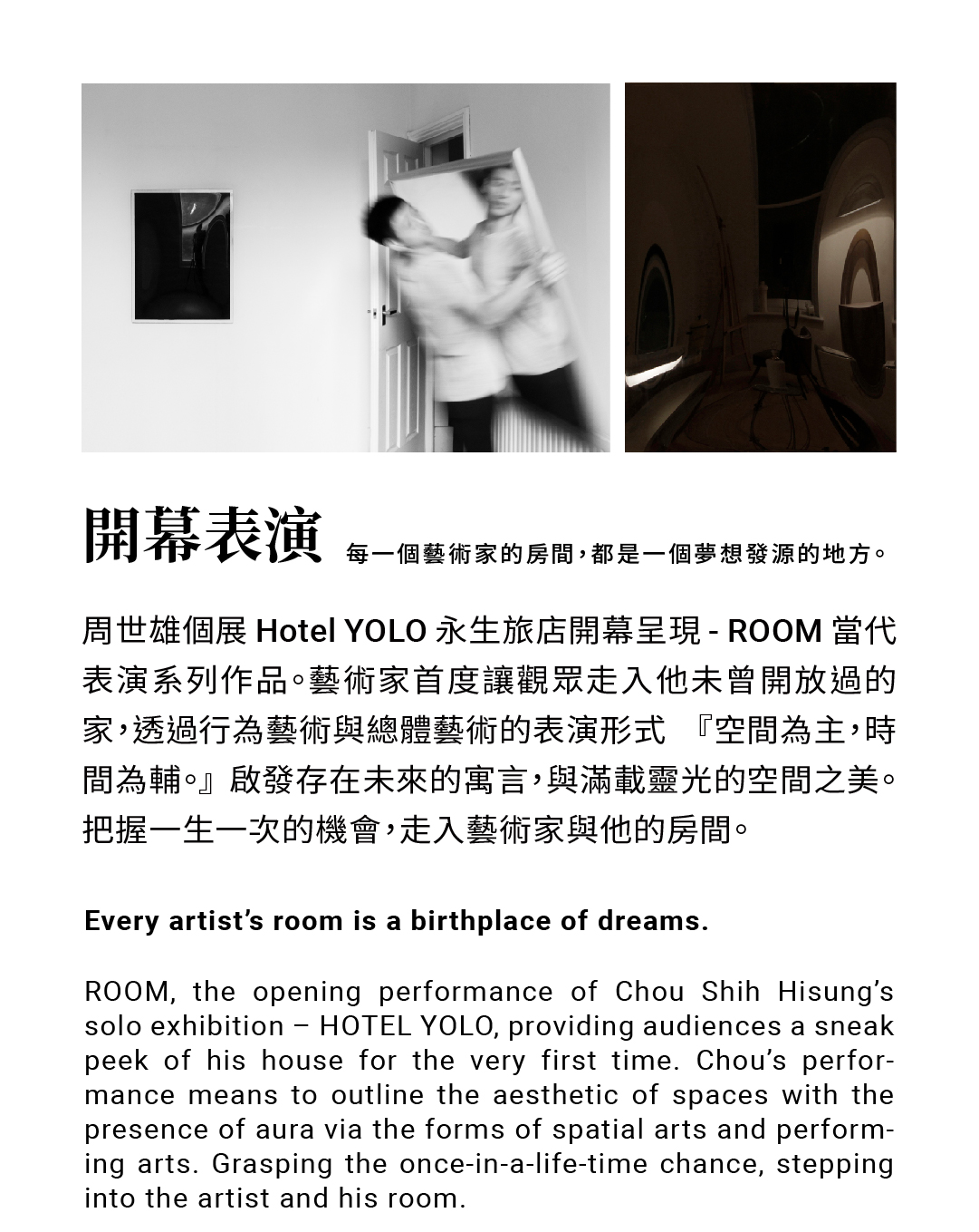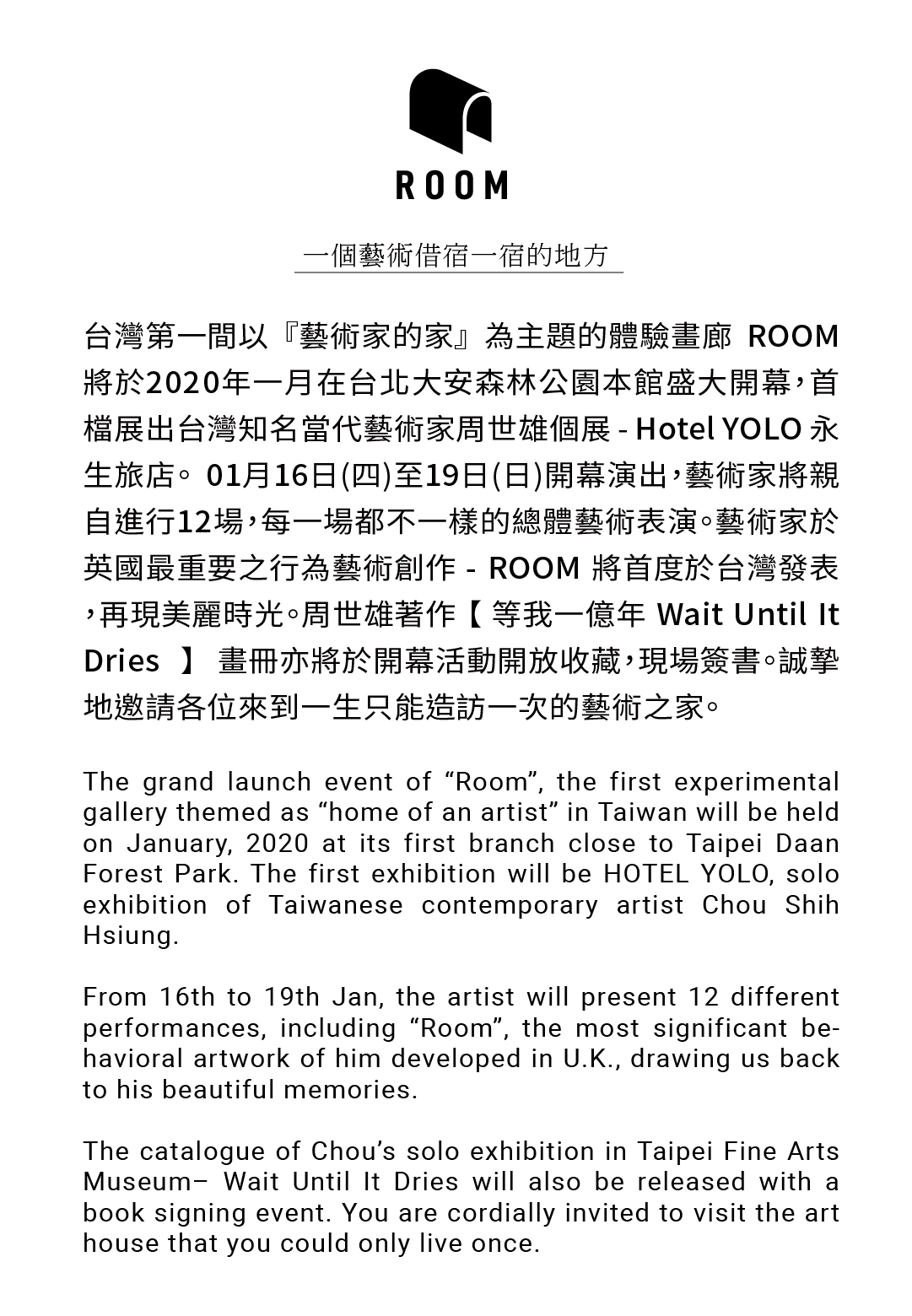 台灣第一間以『藝術家的家』為主題的體驗畫廊ROOM將於2020年一月在台北大安森林公園本館盛大開幕,首檔展出台灣知名當代藝術家周世雄個展 - Hotel YOLO 永生旅店。 01月16日(四)至19日(日)開幕演出,藝術家將親自進行12場,每一場都不一樣的總體藝術表演。藝術家於英國最重要之行為藝術創作 - ROOM將首度於台灣發表,再現美麗時光。周世雄著作【 等我一億年 Wait Until It Dries】畫冊亦將於開幕活動開放收藏,現場簽書。誠摯地邀請各位來到一生只能造訪一次的藝術之家。