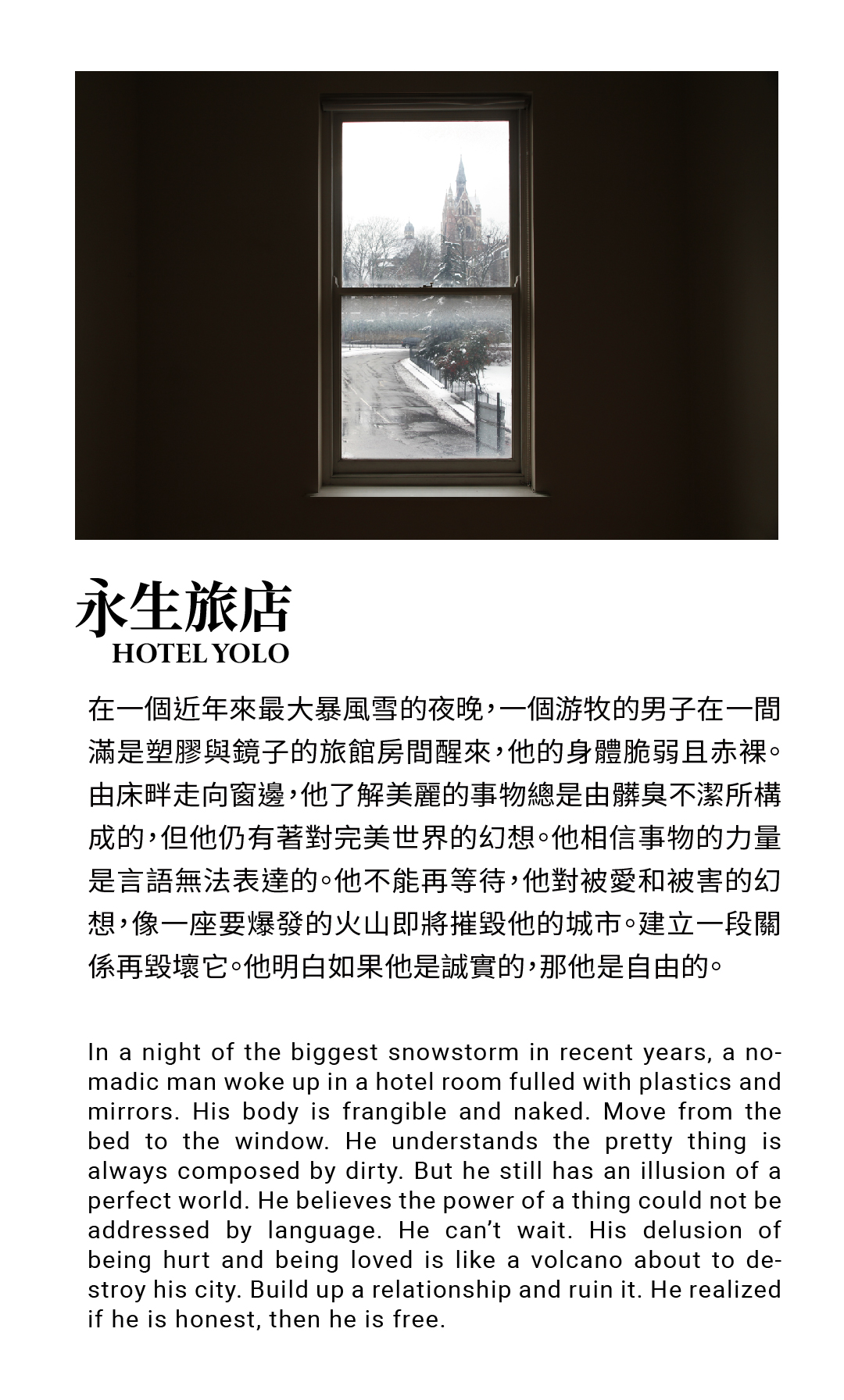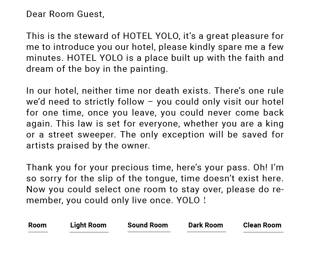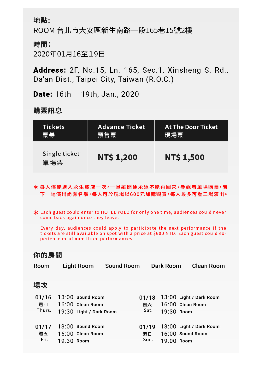 台灣第一間以『藝術家的家』為主題的體驗畫廊ROOM將於2020年一月在台北大安森林公園本館盛大開幕,首檔展出台灣知名當代藝術家周世雄個展 - Hotel YOLO 永生旅店。 01月16日(四)至19日(日)開幕演出,藝術家將親自進行12場,每一場都不一樣的總體藝術表演。藝術家於英國最重要之行為藝術創作 - ROOM將首度於台灣發表,再現美麗時光。周世雄著作【 等我一億年 Wait Until It Dries】畫冊亦將於開幕活動開放收藏,現場簽書。誠摯地邀請各位來到一生只能造訪一次的藝術之家。