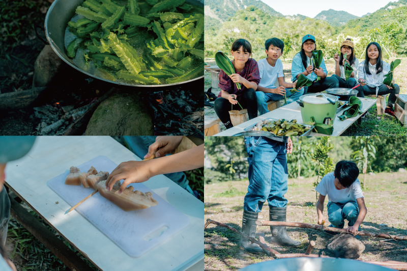 對阿美族人來說,只要一把刀和少許塩,就可以在山上生活不會餓死,族人與大自然的關係,非常緊密,這樣依著山林而生活的方式,也讓奇美部落,發展出山林野炊的飲食文化。營隊中也將帶著孩子體驗傳統野炊與八菜一湯。從第一天小隊方式討論分工、用竹子自製碗筷開始,就是結合親手實做的過程,烹煮料理當天,將帶著孩子到部落山林裡探險,採集與認識野菜,接著一起升火和切肉,進行山林野炊與烹煮傳統八菜一湯的料理,過程中小朋友也可自行交流換菜,享受親手辛勞而來的山野美味。