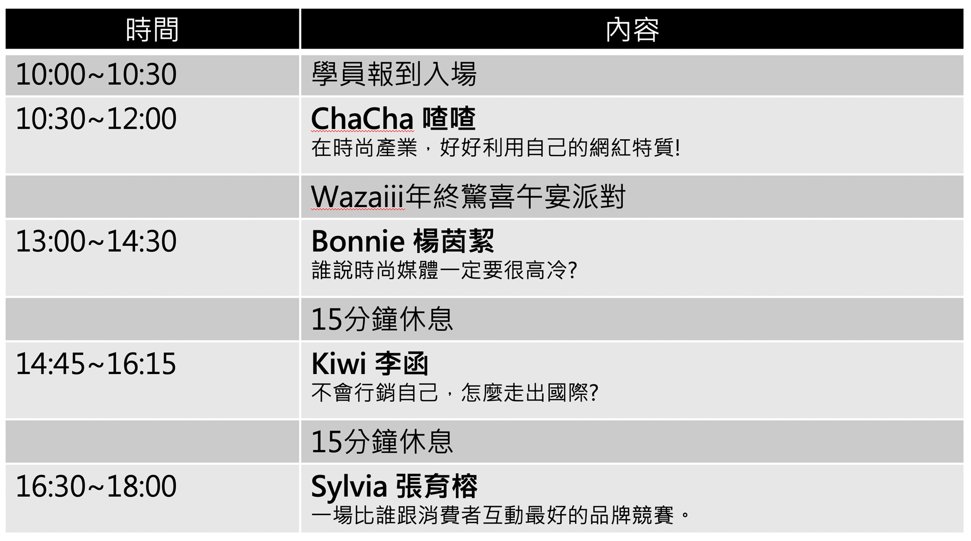 Wazaiii一日密集時尚營召集了4位社群操作的佼佼者,用一天的時間,傳授「社群時代生存交戰守則」給讀者們,並邀請讀者加入Wazaiii年終派對,滿懷感恩的心,總結自己過去辛勤的一年。