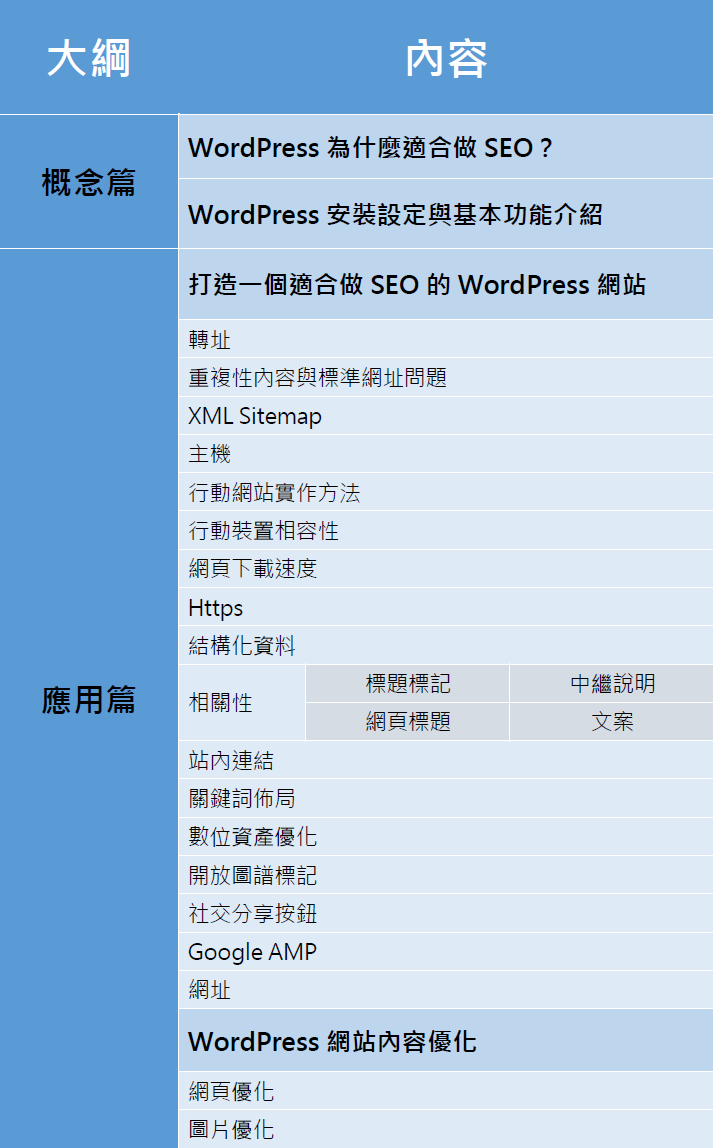 但目前國內WordPress 相關課程,大多以教授WordPress 網站的建置與管理為主,對於如何充分發揮WordPress 適合對搜尋引擎友善的特性,把SEO 做到最好,普遍缺乏系統性的探討。因此本次課程,台灣SEO先驅連啓佑老師特地規劃6小時的精華內容,將帶大家迅速掌握WordPress SEO 的重點,並能實際運用在工作上,有效提升網站行銷效益。