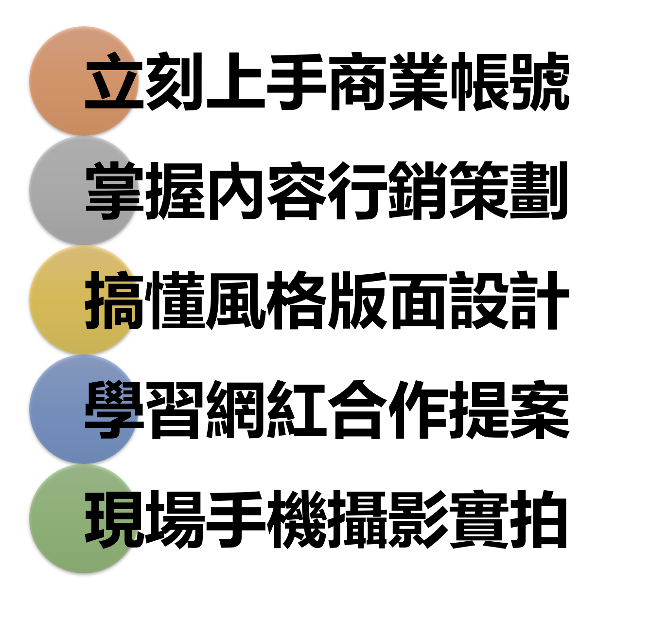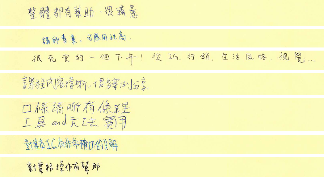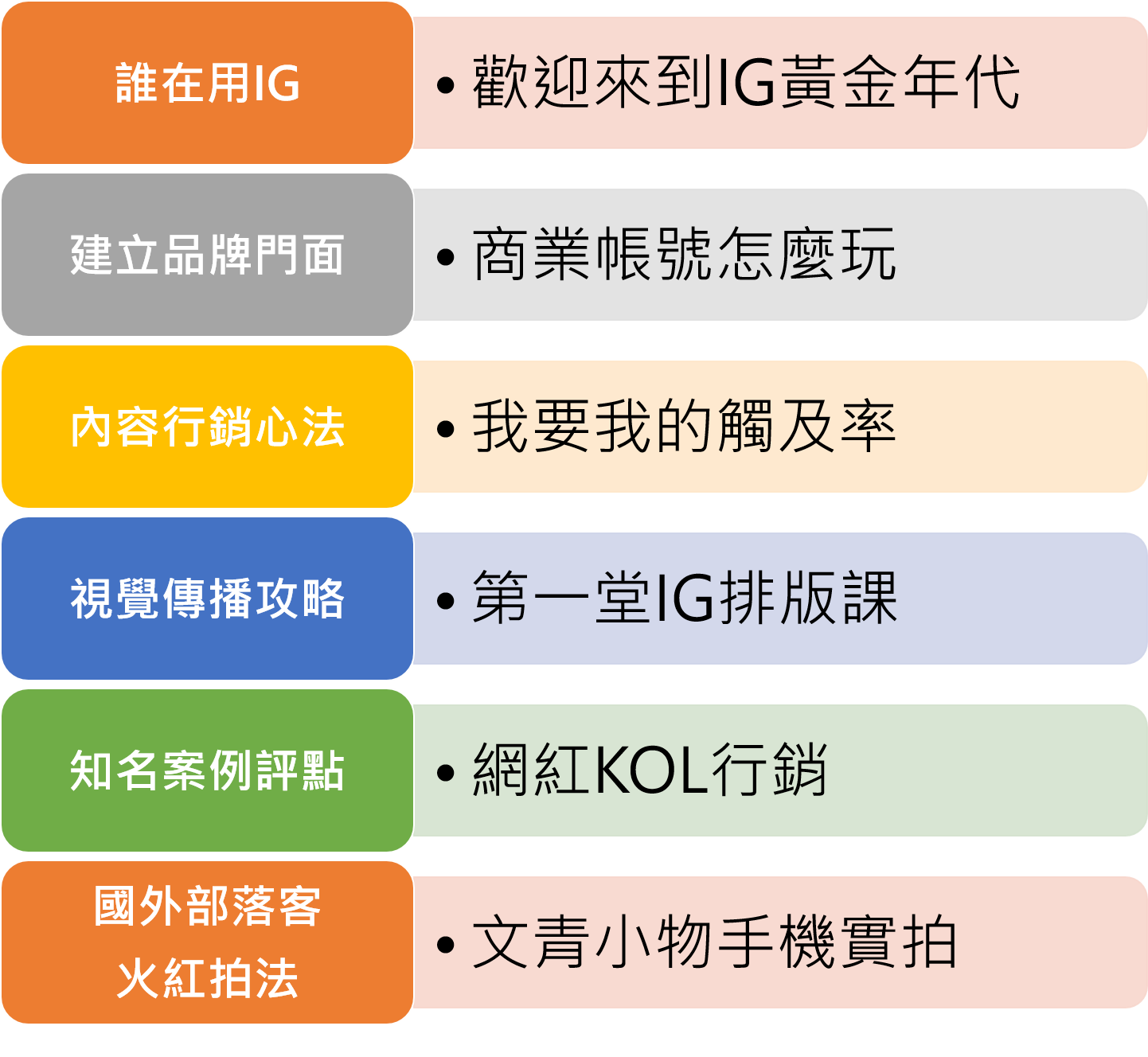 本次課程,邀請到知名IG影像暨文字創作者4Samantha,從最基礎的IG行銷理論開始,帶你一步步打造專屬的商業帳號與宣傳策略,並透過知名品牌案例分析搭配現場的拍攝實戰,讓你不論是個人事業或品牌行銷,都將能在IG上突圍成為人氣黑馬。