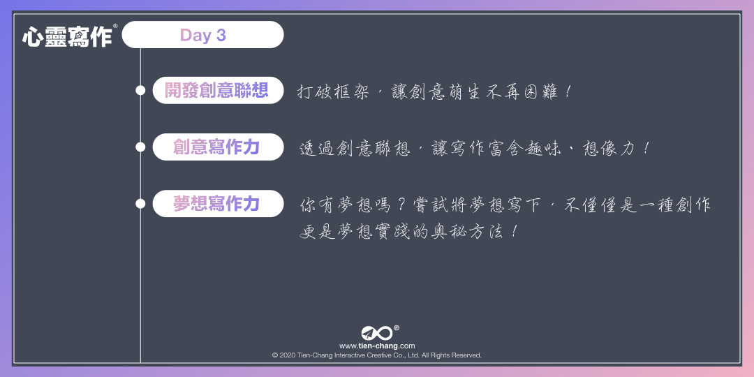 一開始,老師跟大家建立寫作的觀念,寫作是要表達內在的感受,而不是感覺。很多時候,我們寫的都是我們的感覺,而不是感受,光這個點我就很受用了。透過老師的引導,3分鐘、5分鐘、10分鐘的練習,寫出自己當下的感受,這個練習可以讓我們的情感有出口,也可以讓我們的注意力更集中,同時也可以將閃過的意念抓回來,很多時候,好的 Idea都在突然中產生,若不紀錄下來,會在不知不覺中流失,這樣會很可惜!