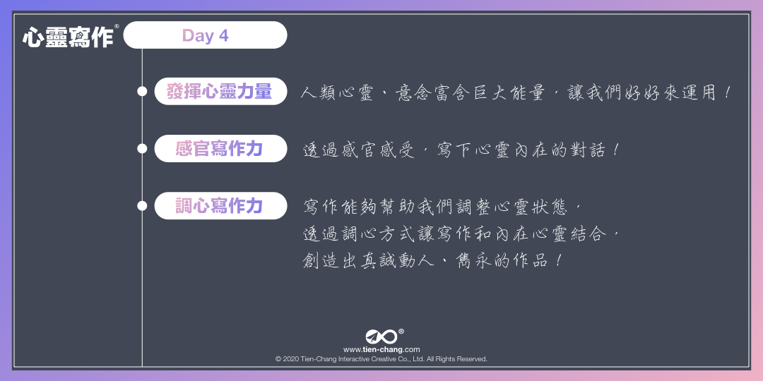 心靈寫作是一個很好的舒壓方式,每天撥一點時間跟自己獨處,感受自己內在的聲音,沈澱一天的心情。