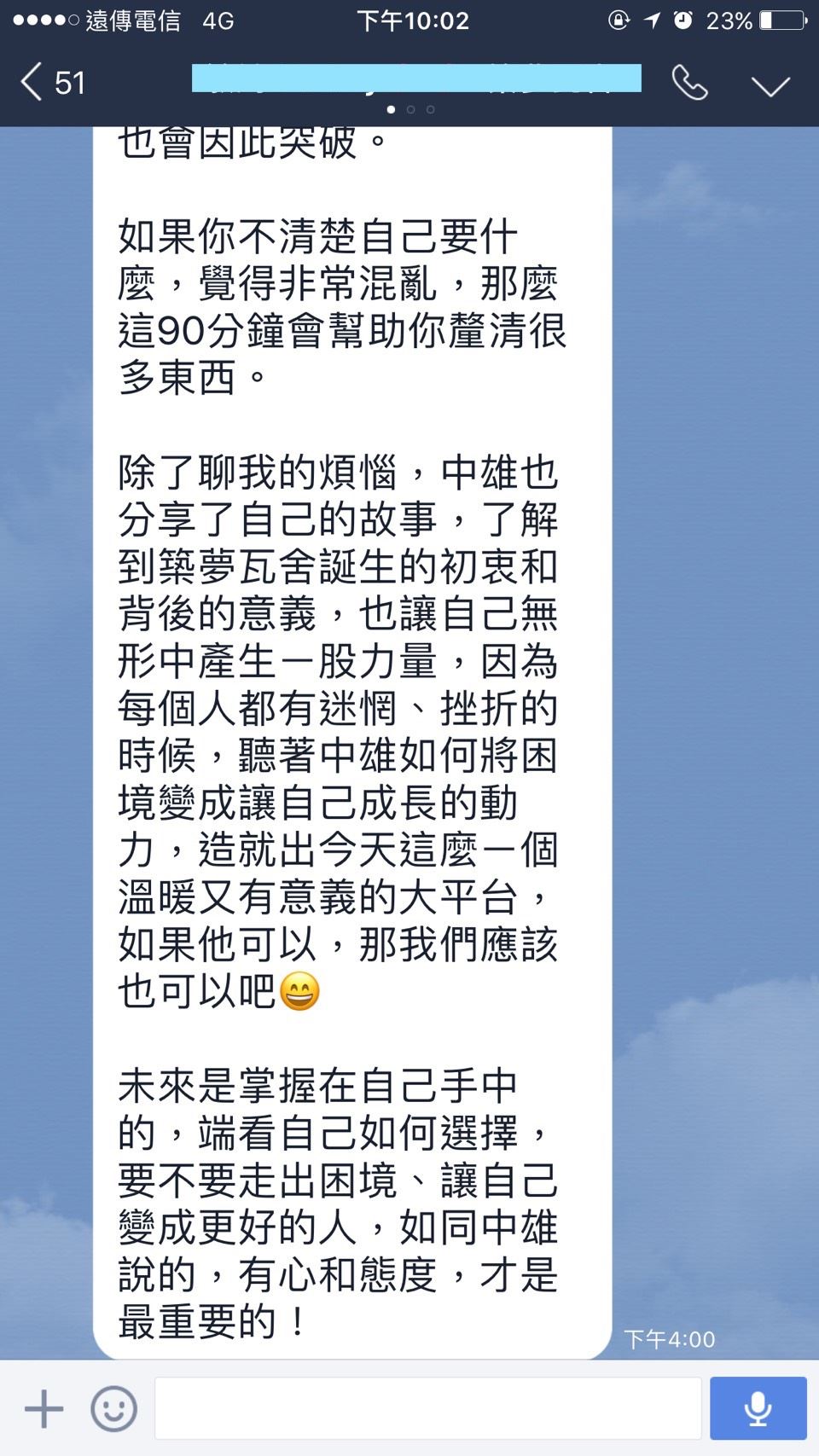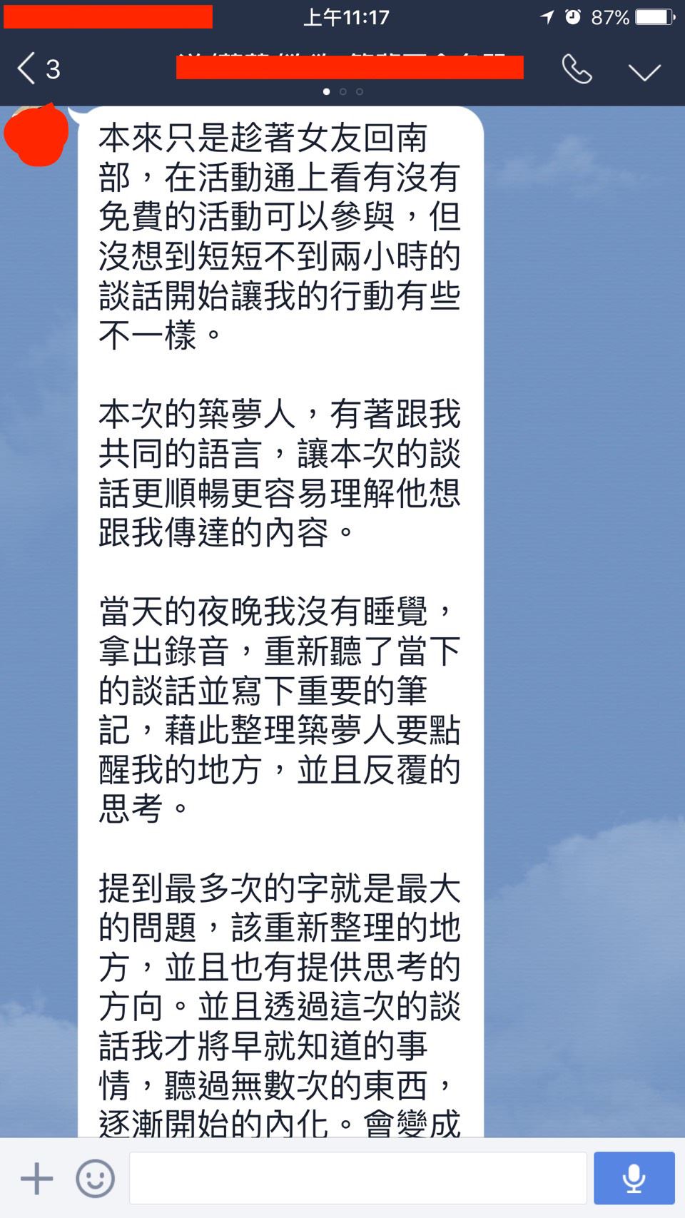 6. 若臨時有要事取消活動,請提早通知您的築夢人另約時間即可,築夢人期待幫助真正有心改變現況的朋友,只是報名人數眾多,怕您的優先權利不見了,感謝您的配合