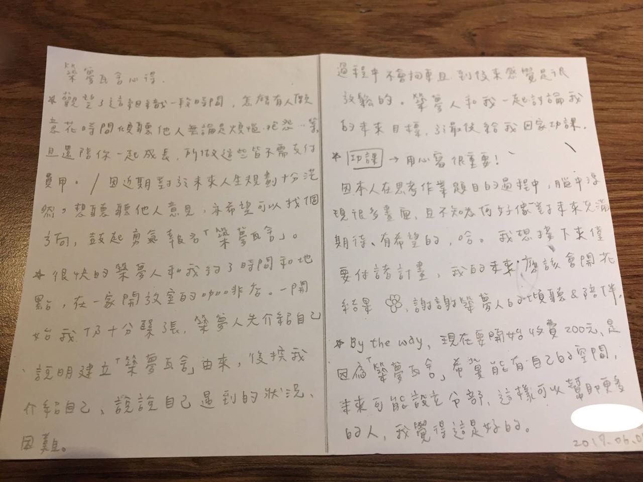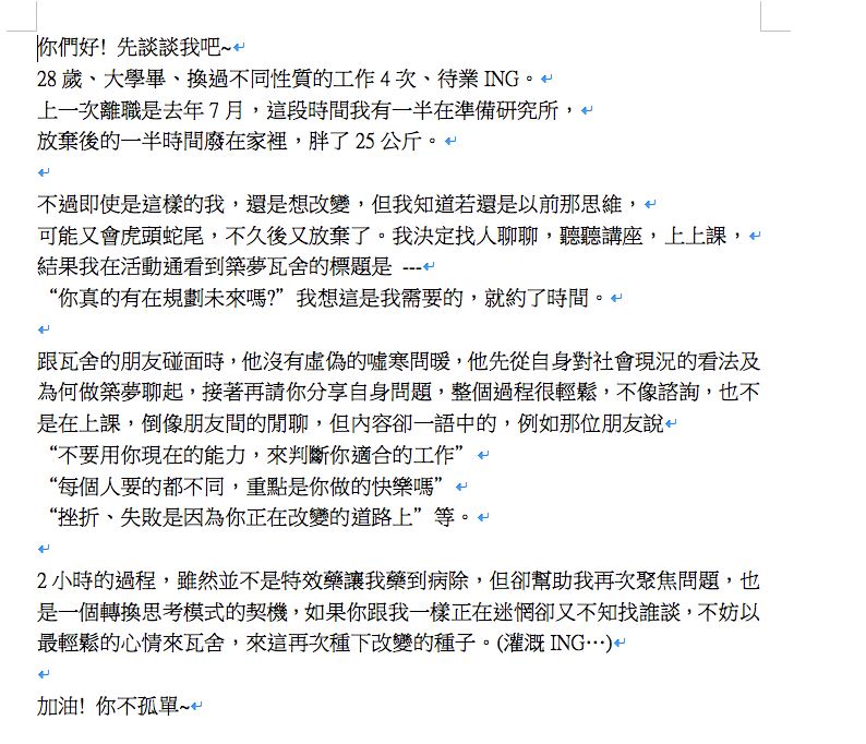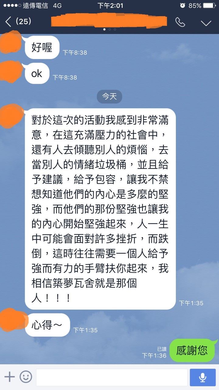 4.由於近期有很多只是好奇而報名而來或不來的朋友。本身並無改變自己現況的意願。意願比能力重要。卻因此而犧牲了有心改變自己卻無法排進活動的朋友權益(由於築夢瓦舍採取1對1談心方式進行)。築夢瓦舍有感於此,故現在會事先詢問意願。絕無懷疑朋友之心,僅秉持公平正義原則維護朋友權益辦理活動。築夢瓦舍感謝各位朋友配合。
