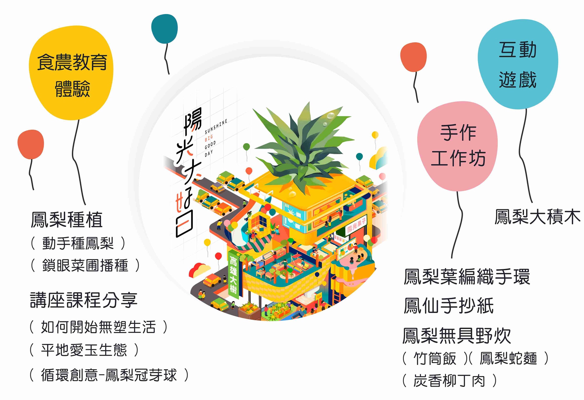 陽光大好日為收費方式進場,課程安排有鳳梨五感體驗活動,所有的體驗課程有分別時段也都是錯開的,非常建議您上午就進場,每個活動就都可以參與喔。
