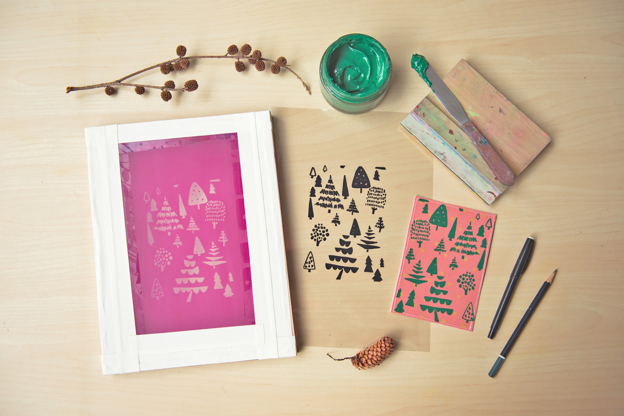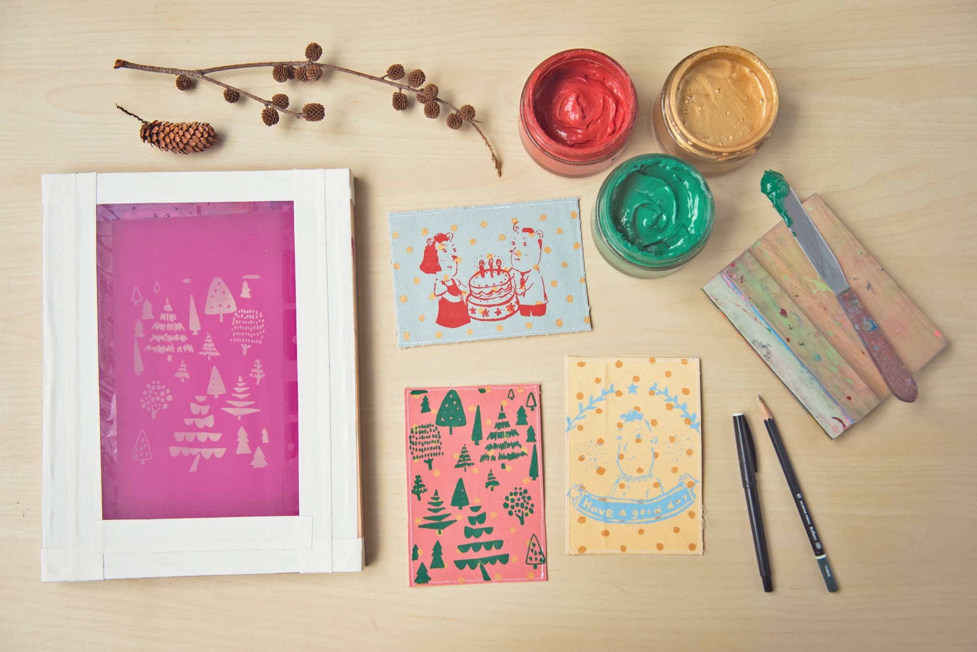 印花塾招牌進階絹印課程:感光製版印花的禮物季特別版!學員將從印花圖案設計開始,製作出專屬自己的絹版,再以對位方式印製,大量產出也完全沒問題。