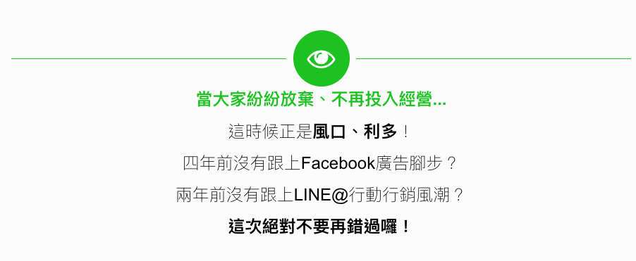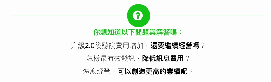 許多人都聽聞 LINE@ 要升級改版為 LINE 官方帳號 2.0,聽說費用好像增加很多?聽說更難經營呢?聽說…聽說…好多的聽說,但你絕對不會聽到一些關鍵的「解密」、「解套」方法,為何呢?因為現在正是最佳的「改變經營策略」的最佳時機點,也是最好檢視過往經營的問題,修正後高飛最佳時機!越少人經營,就只有少數人越有利!現在由台灣第一位LINE@官方認證講師 劉滄碩 (ANDY) 老師,精心規劃、2019全新課程: