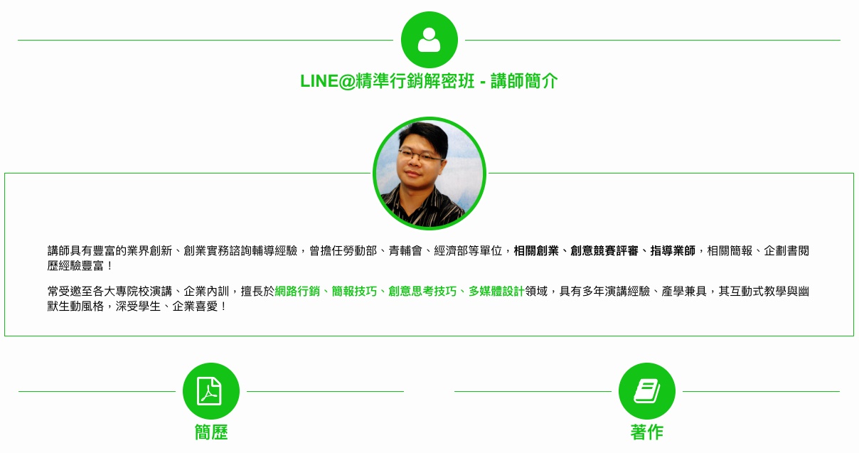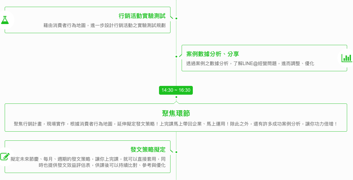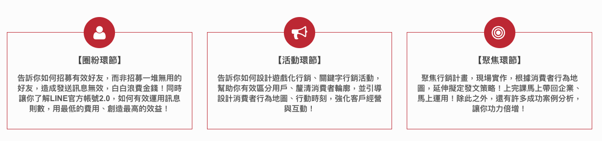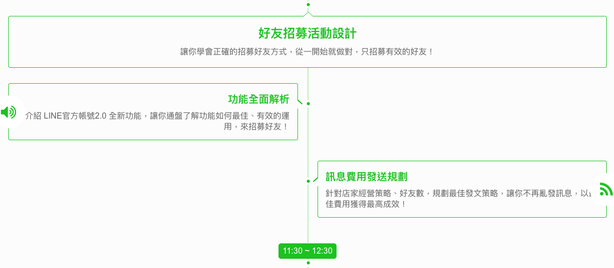 課程中將告訴你 LINE官方帳號2.0正確的經營關鍵秘辛!分成 三大環節、六大模式、九大檢測工,以輔導超過500家實體店家、網路電商的經驗,讓你可以快速上手、順利轉換、升級LINE官方帳號2.0,深度經營客群、
