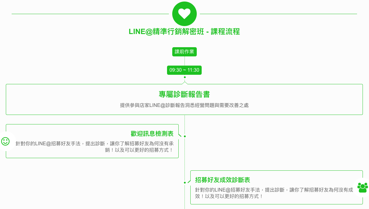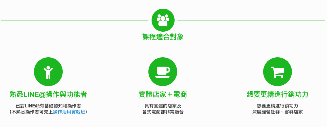 LINE@ 精準行銷解密班,將採用工作坊形式授課,而且不僅僅只是課程當天授課,從學員開始報名,就會有課前作業、課前問卷,課程中採用分組討論、實作演練,針對你的問題實際討論與分析、研究,同時又可以藉由學員彼此之間的分享,學習到更多經驗與實務操作,課後還會有專屬討論社團,持續互動、追蹤上課進度,讓學習成效延續,達到最佳效果!
