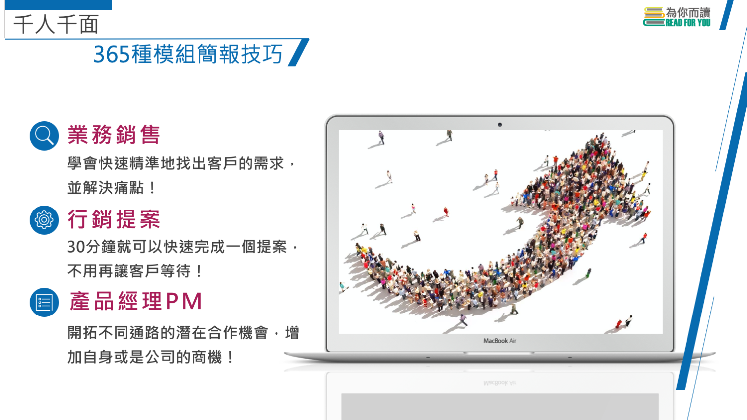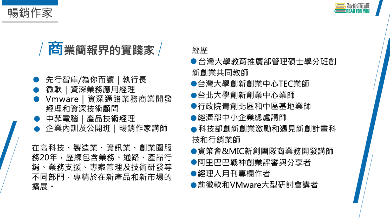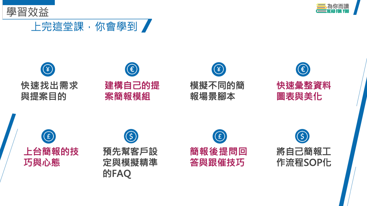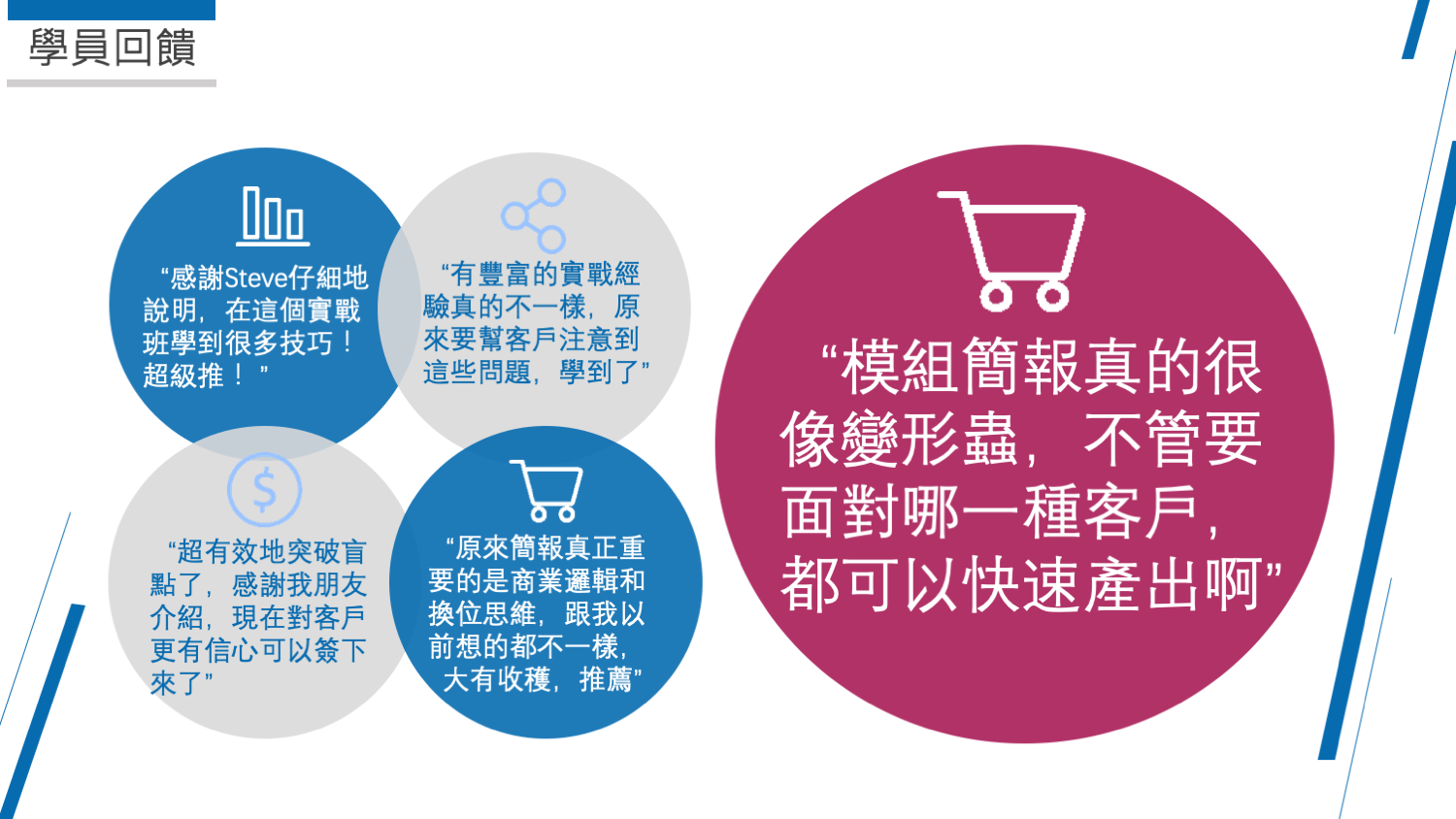 集結他過往的這些精華經驗,更能理解商務人士究竟想要什麼!今天將直接重點整理給你聽!這堂課程除了告訴你簡報前該怎麼收集資訊外,更教會你建構專屬自己的客戶簡報模組,及提案後該如何追蹤與push成交,讓你產出的簡報不再只是一場耗時耗力卻徒勞無功的煙花秀!