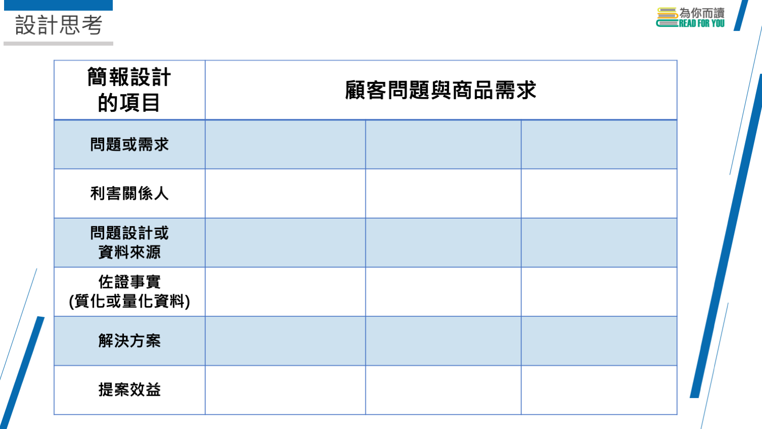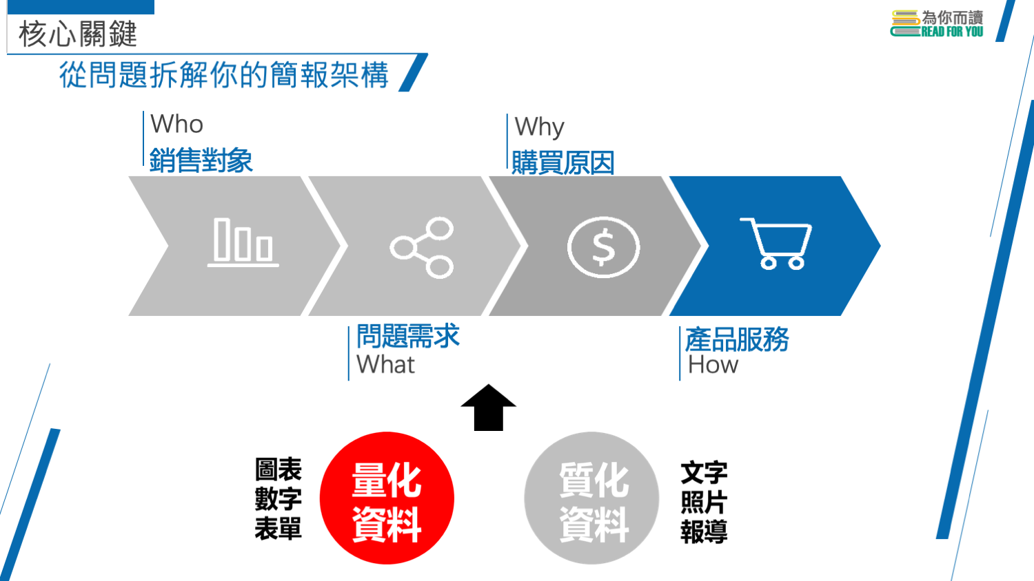 簡報,說穿了就是一個工具,真正的knowhow從來都不只在簡報中。如果你過往學的簡報技術都無法幫你達成目標與結果,那就表示你搞錯重點了!完整的商業的思考邏輯才能真正有效寫出對的提案,不然就會變成客戶要雞腿,你卻塞給他難吃蔬菜的窘狀。