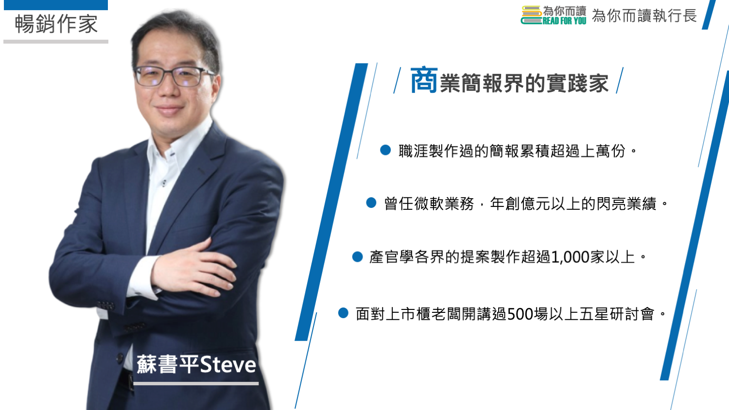 不管你想要成交的老闆還是客戶,沒有比Steve經驗更豐富的實戰派講師!曾任微軟超級業務的Steve,擁有年創億元以上營業額的豐富商業經驗。過去20年,他累積產官學提案超過1,000家以上,面對高挑戰的老闆群開講超過500場研討會,實戰中所作過的簡報更累積超過1萬份以上。為什麼他可以創造驚人結果,靠得就是他獨一無二的邏輯,而他將這套商業超強邏輯完全融入模組簡報術中!