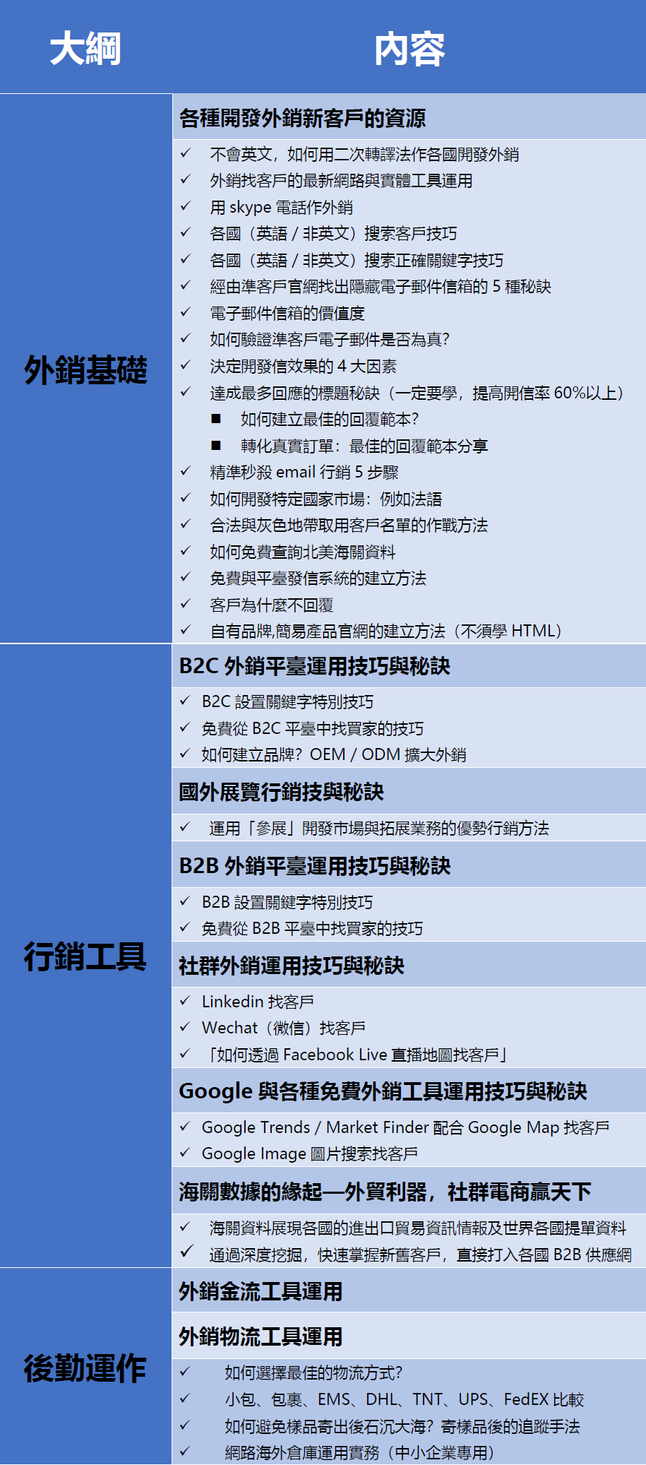 本次課程,特別邀請具有輔導數百家廠商開拓國際通路外銷經驗,「高青國際」的林友程執行長,告訴大家如何為自家產品與服務,開啟邁向國際的實體/網路通路,並分享B2B與B2C的獨家行銷手法,以及各國際銷售平台的優劣觀察,讓您學會如何在國際市場上有效管理市場、拓展並深耕客戶,並找到最適合的金/物流方式,讓每一分資源都在國際市場上取得最大的收穫!