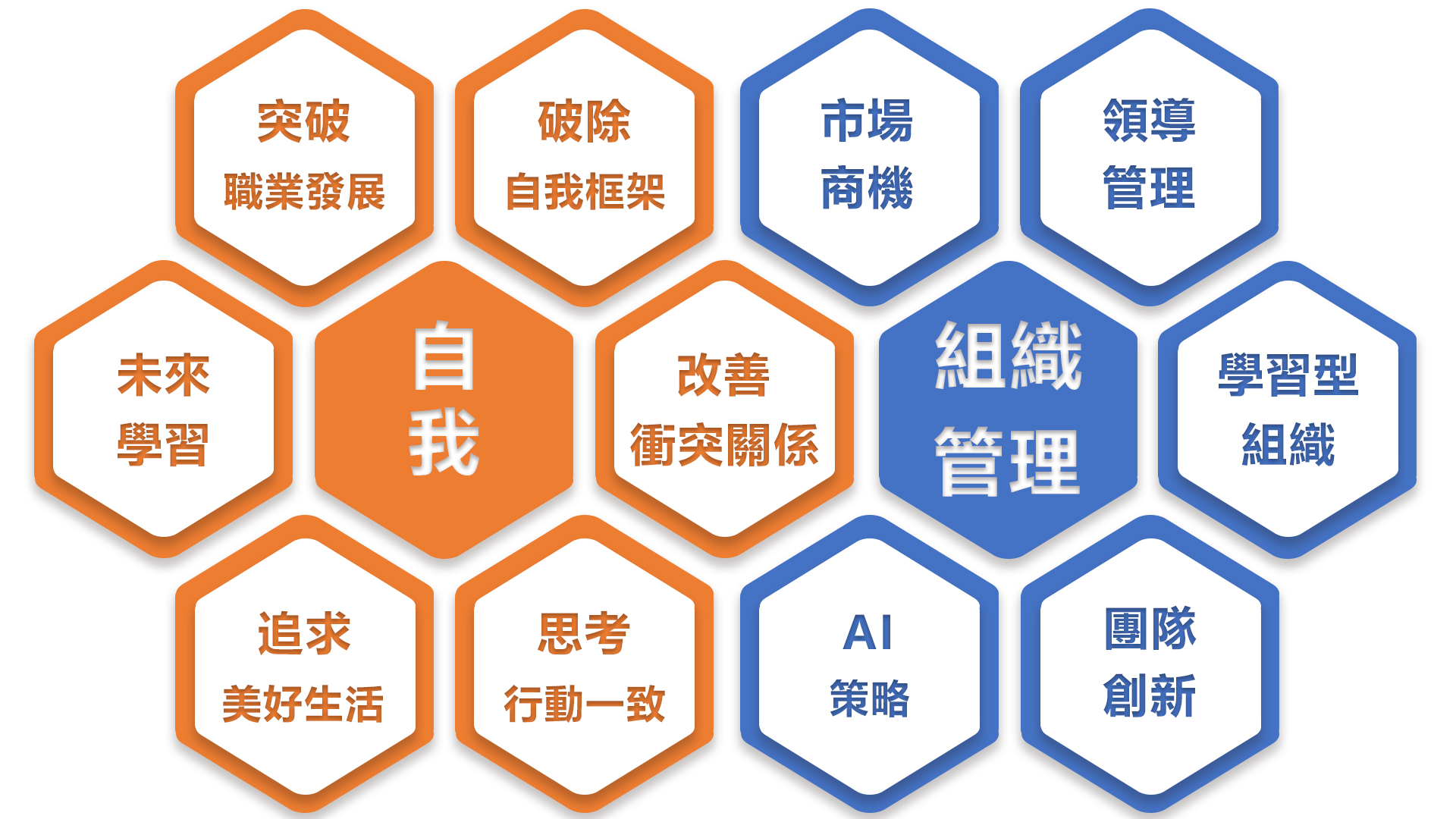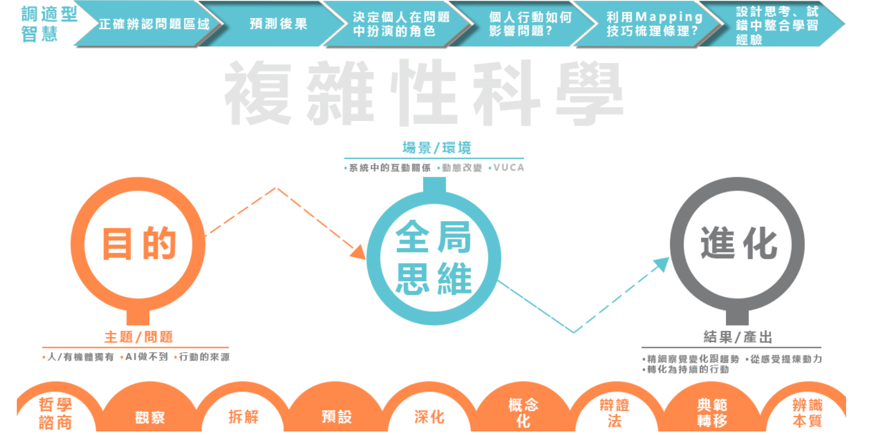 | 未來學習 | 第二部分由6個3小時的主題所組成。 深化學習用「哲學思考,神經語言學,還有衝突管理」三個迥然不同的思考觀點組成的創新思維,去面對「未來時代的學習」這個大哉問,學習「複雜科學(complexity science)」這個領域中,如何使用「調適性智慧(adaptive intelligence)」結合理性與感性,成為不需要擔心在AI時代被機器取代的「新時代智人」。 |