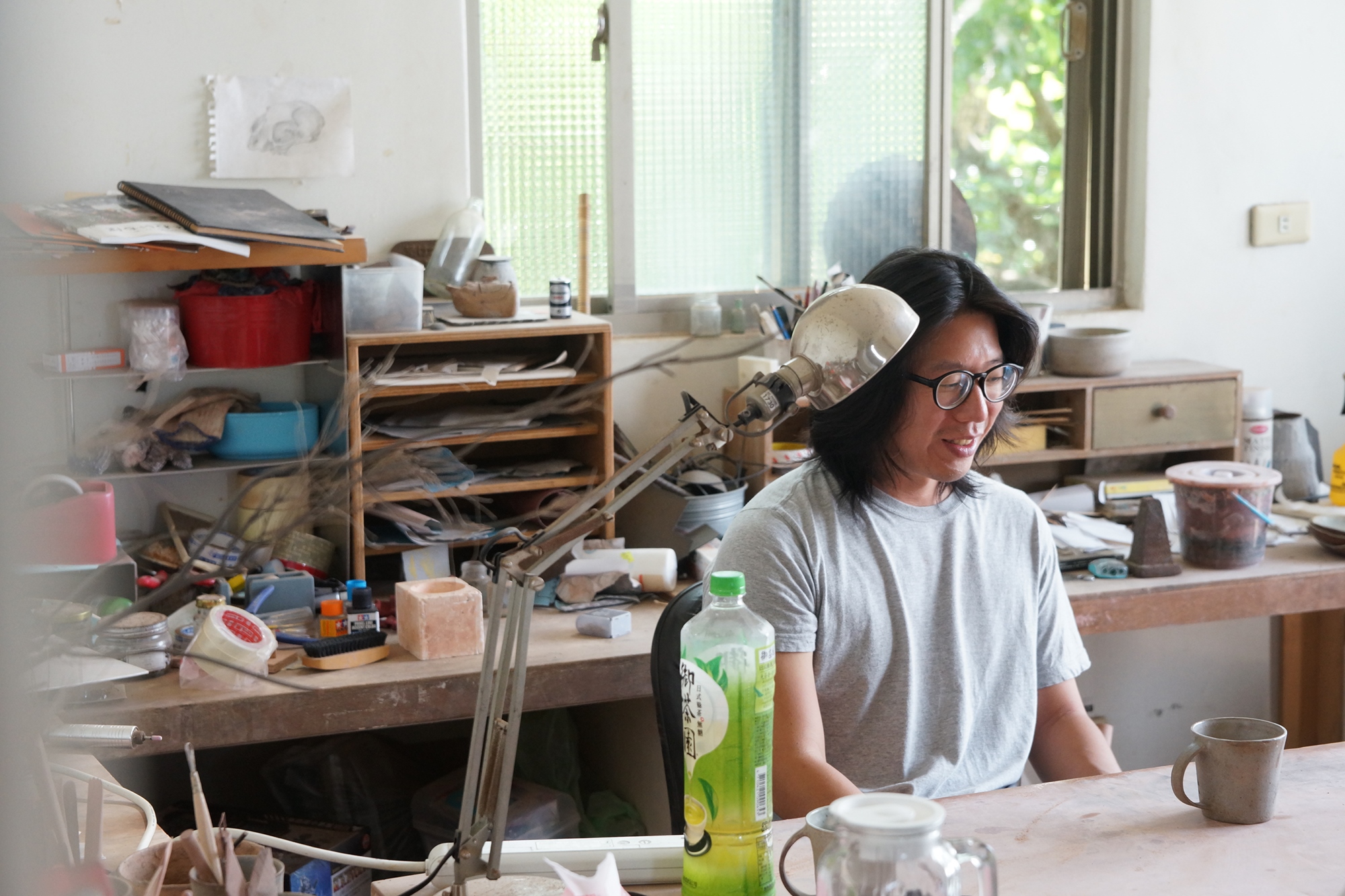 拜訪作家日選在十月氣候漸涼的時節,我們坐了一段很長旅程的公車,看著車窗景色由都市常景、慢慢轉變為山巒與海平線。張仲禹工作室座落在金山的獨棟透天,屋內散置了製陶工具、土胚半成品、長年收集的鐵片零件、和幾件複合媒材的互動型雕塑。相較於過去拜訪的創作者,張仲禹的工作空間與日常起居的區隔性沒是很大,彷彿生活早已是工作的一部份。而談及獨立工作室的生活壓力,張仲禹的態度顯得輕鬆:「剛開始當然也有為生活經濟緊張的時候,但現在已經不太會了,也可能也因為我很幸運,拮据時剛好都有一些進帳。」恬適淡然的態度,不由得為他的耐心與定力感到欽佩。