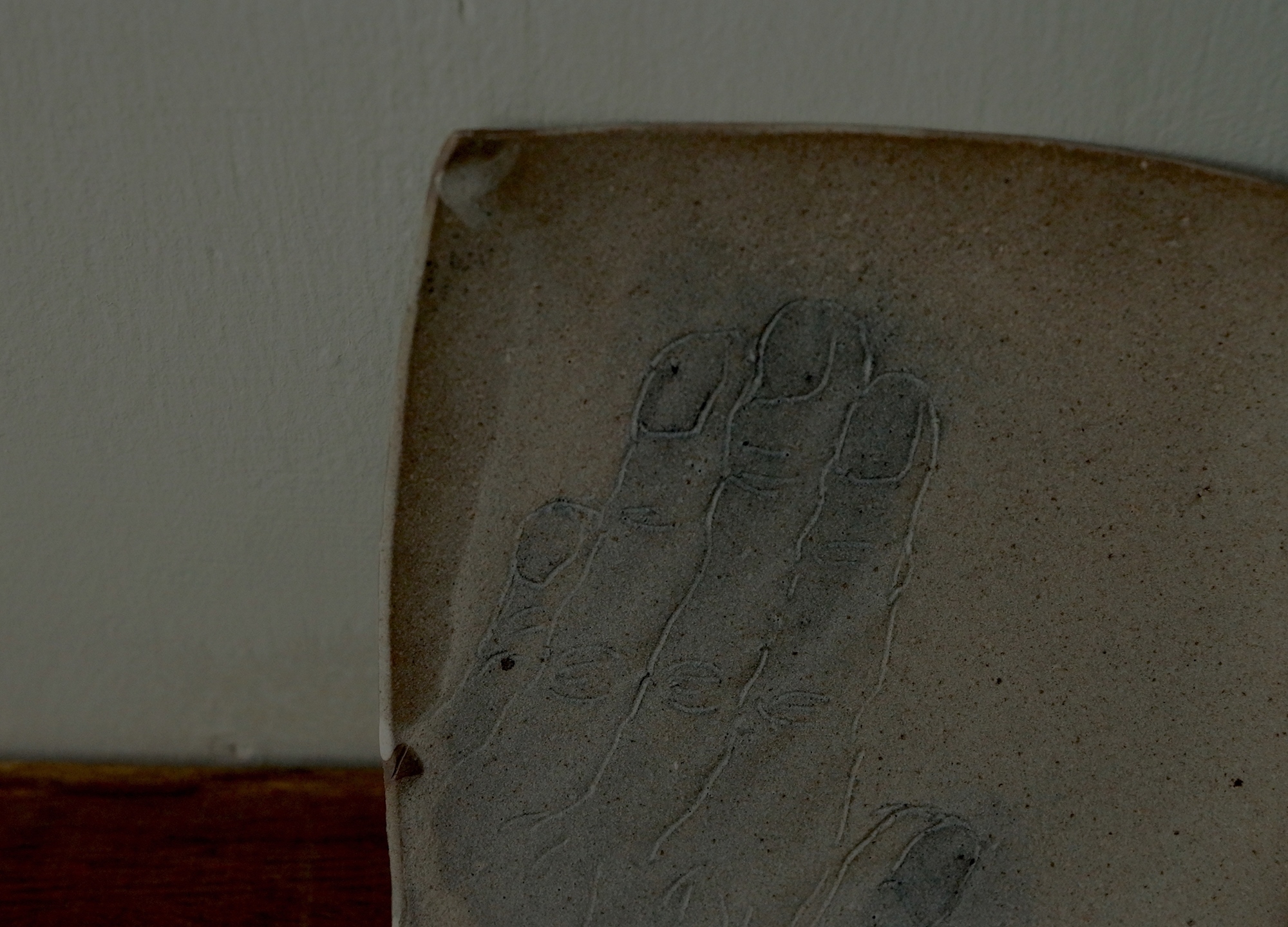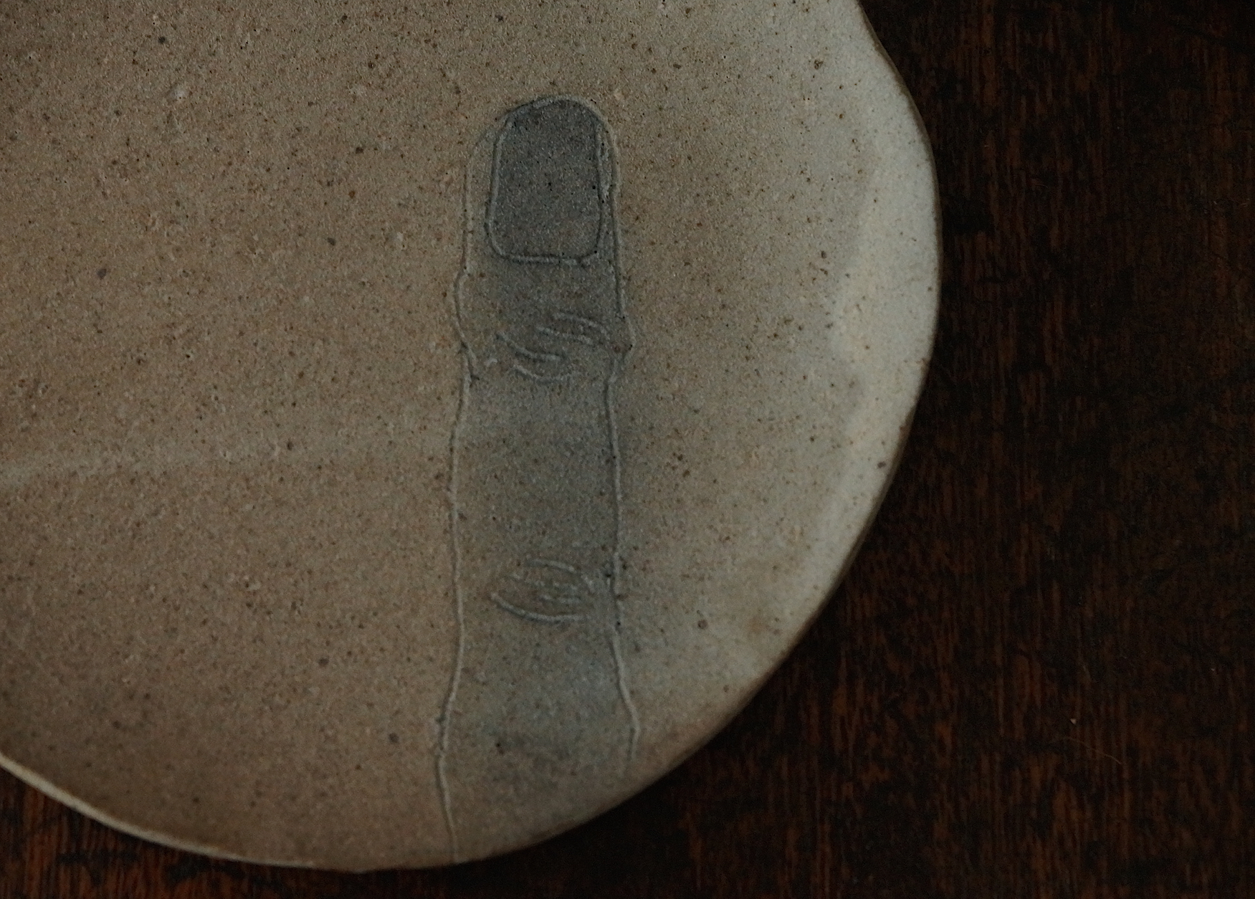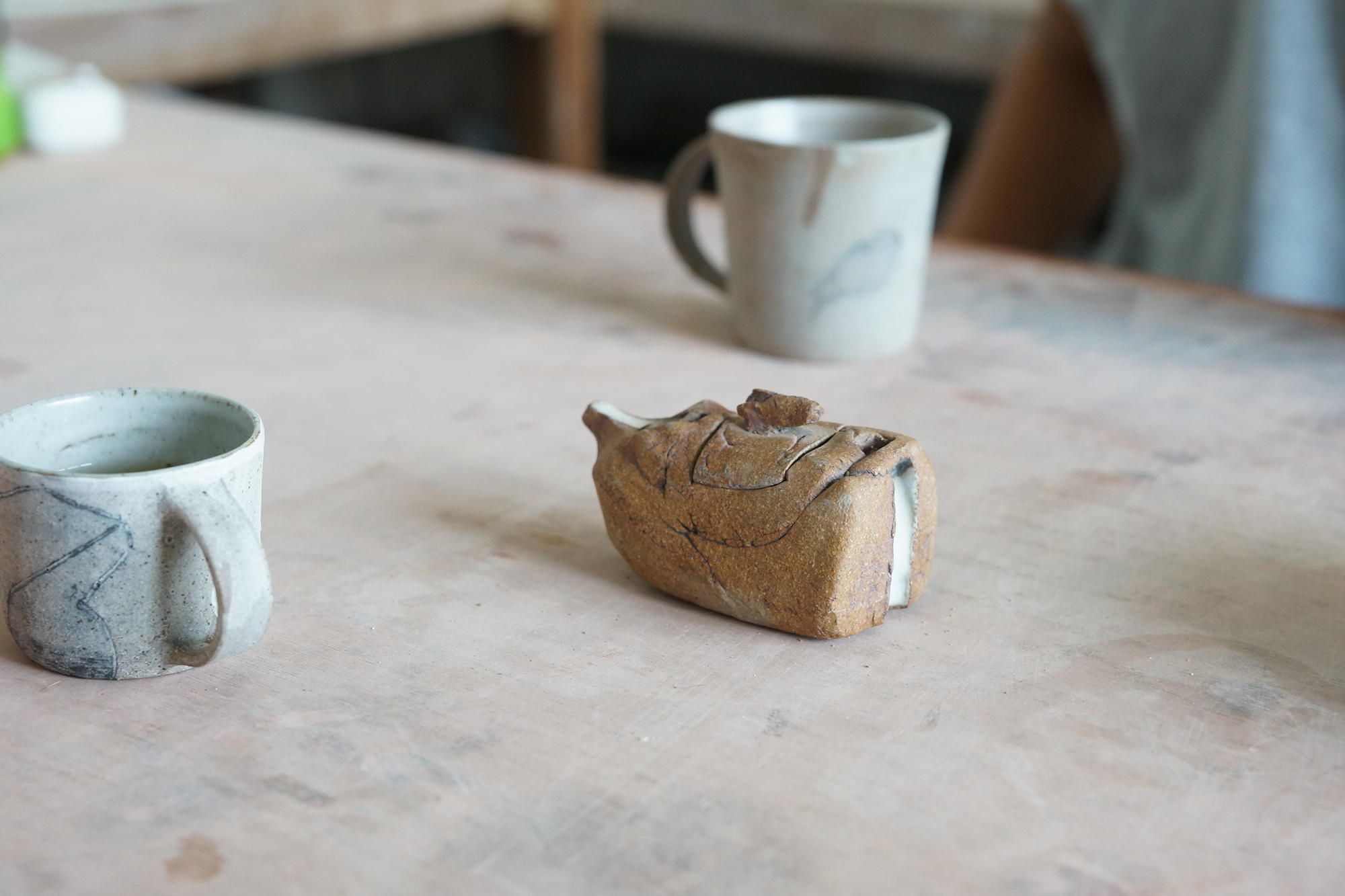 聊到創作時,張仲禹也侃侃而談:「除了和章格銘老師習陶的基本功,在徐偉斌老師身旁的工作經歷也影響我很多。徐老師非常要求、也很嚴格,他認為工作(創作)前最重要的就是觀察,再思考要用什麼質感、形狀、顏色等等。」徐偉斌老師除了是知名室內設計師,也是藝術家與陶作家,張仲禹拿出老師當年贈與的手捏茶壺與我們分享。雖然是茶壺,比較像一團沒有提把的土塊,頂上開了一個方型的壺蓋。沒裝茶水的時候,會忍不住像摩挲鵝卵石般的在掌中把玩,似乎在茶壺的外型中找到了另一種療癒功能。「老師的作品是很自然的,也是我一直很嚮往的創作方向。其實未來想做作品之間差異性比較大的創作,創作過程的刺激對我來說是重要的。」張仲禹從旁補充。對於已經熟稔的創作方法,也欲擺脫重複性的量產模式,轉變的契機其實也可以在作品中窺見端倪,如這次展出作品中,其中一系列的生活陶就刻劃了日常的貼身事物,像是煙盒、拖鞋、眼鏡、英文標語…等等,不同的圖像描寫,也是跳脫慣性勞作的方式之一。