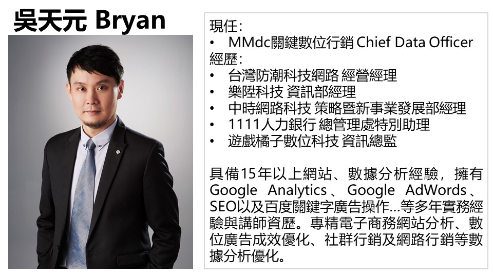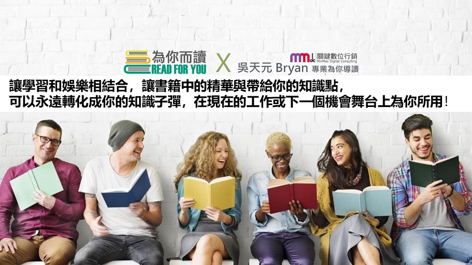 講師吳天元Bryan現任MMdc數位關鍵行銷CDO,希望能將自己多年來累積的學習方法,以一個月一本書的進度,透過深入導讀+學員討論+相關的內容、圖文、影音的補充,讓學習和娛樂相結合,讓書籍中的精華與帶給你的知識點,可以永遠轉化成你的知識子彈,在現在的工作或下一個機會舞台上為你所用!