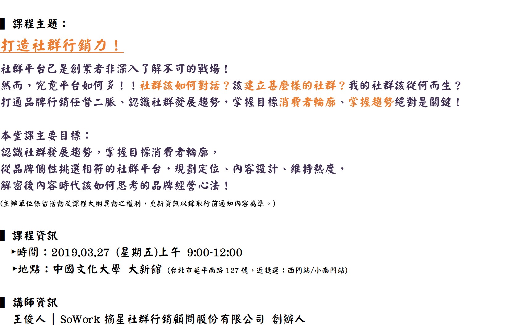 Pccu Startup DNA創新創業講堂─【3/27(五) 打造社群行銷力】