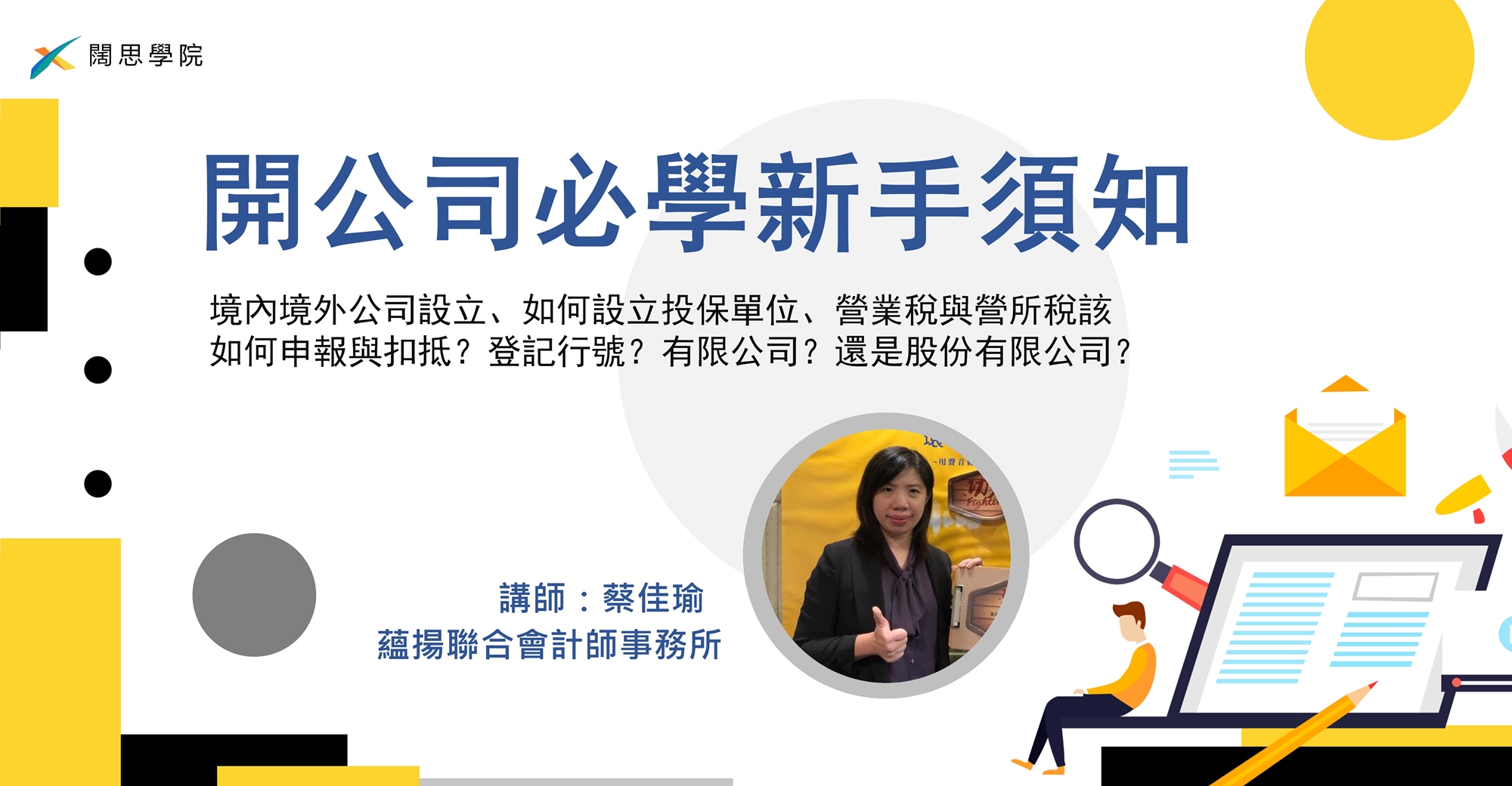 本次課程特別邀請《蘊揚聯合會計師事務所》蔡佳瑜會計師,來教大家開公司的新手須知懶人包,創業初期的組織運作與營運流程,以及正確的財稅管理觀念,幫助您有效且合法的達到節稅的目的!近期想創業的朋友千萬不要錯過!