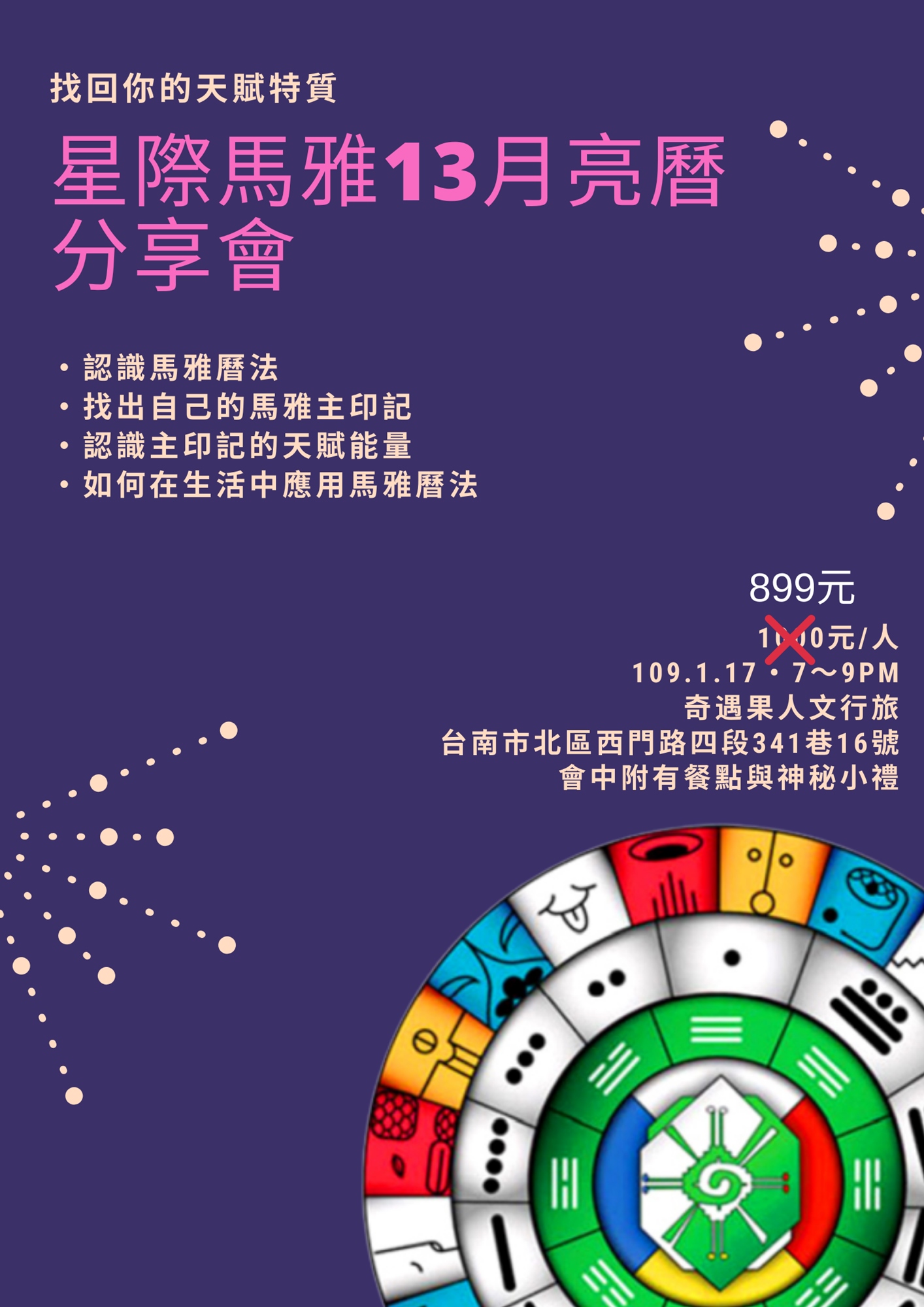 分享會中你將:・認識馬雅曆法・找出自己的馬雅主印記・認識主印記的天賦能量・如何在生活中應用馬雅曆法