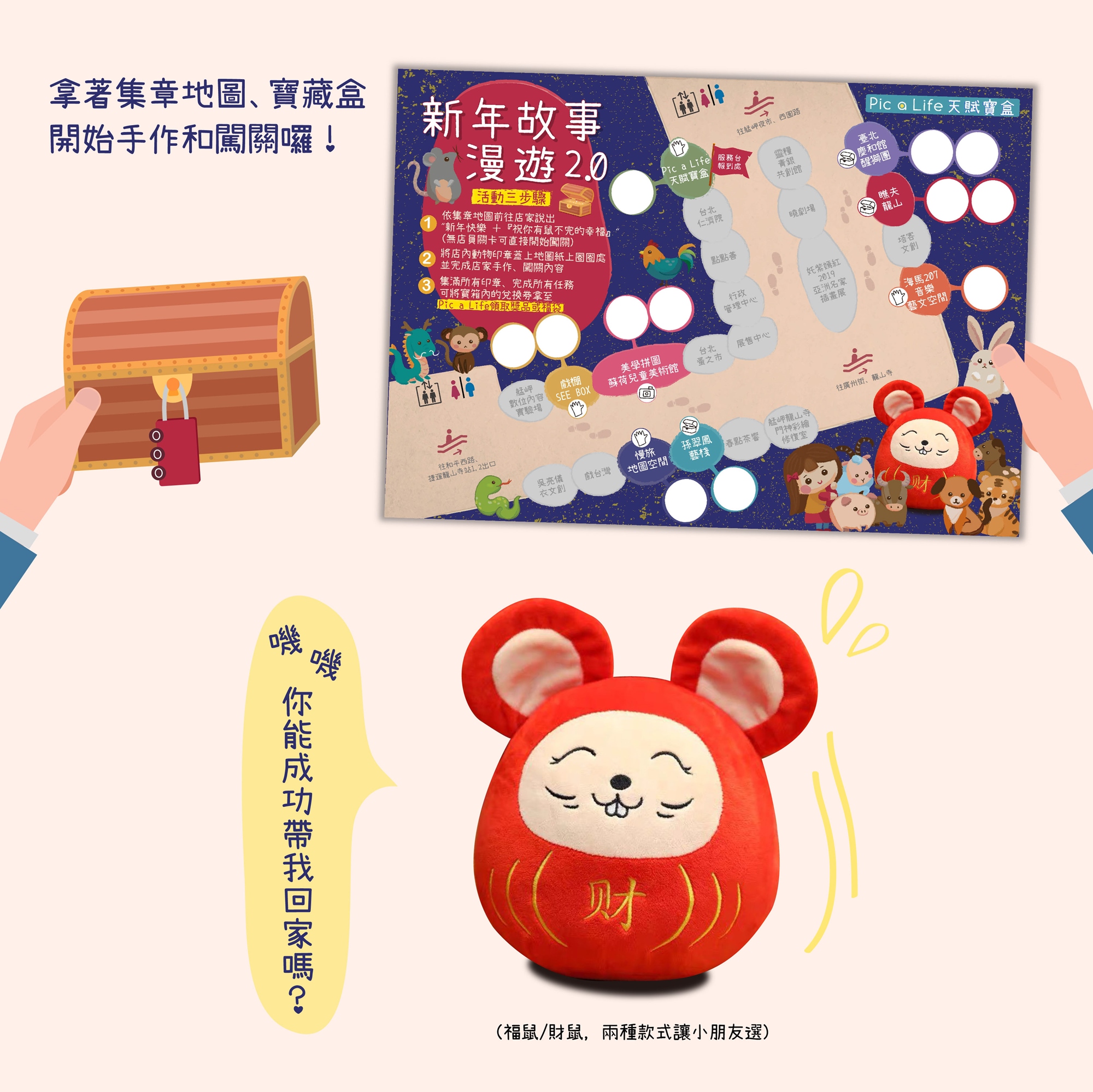 4️⃣獎-->集滿所有印章,完成所有任務,即可將寶箱內的兌換券拿至Pic a Life 領取獎品(福氣鼠)或福袋(須出示票券)