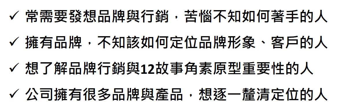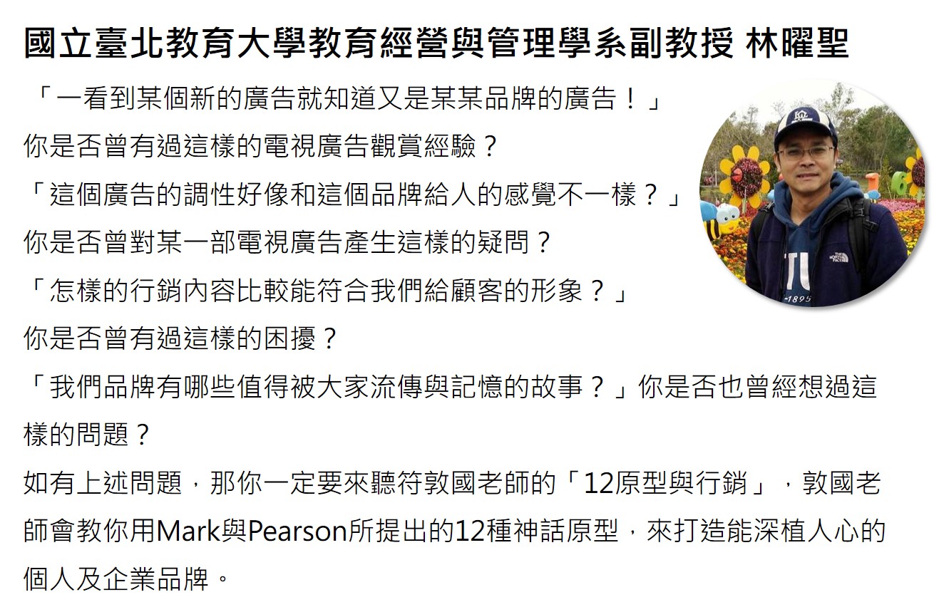 本次課程,邀請到人生創意引導有限公司負責人符敦國老師,運用有趣的故事情境演練與討論、加上大量的故事原型與案例,帶我們有效產生創意模型、運用12故事角色定義品牌、客戶,並透過消費者心流架構,讓消費者進入12故事角色原型心流結構,行銷並順利買單。從分析、定義品牌、消費者定位程序,打造產品規格、產品性格、品牌人格,三格一致的個性品牌!更將帶我們打造創新品牌定位,讓品牌形象更鮮明,一步步打進人心!