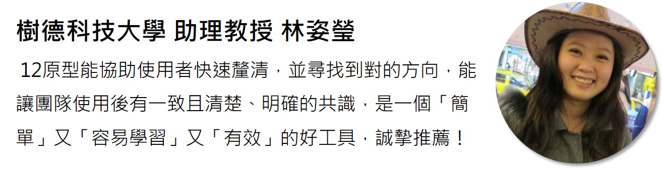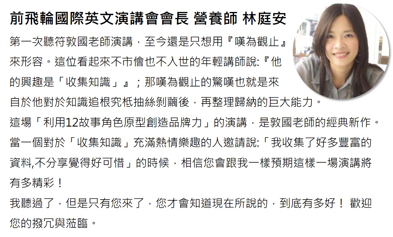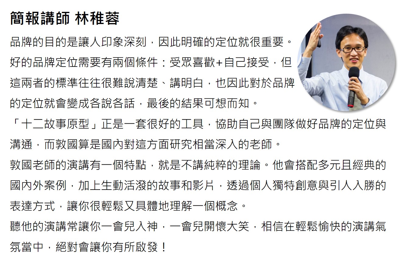 符敦國老師在美國紐約州立大學創意學研究所學習期間就致力於研究創意系統思考與團隊引導,也發現思考引導模型對於溝通創意時的重要,因緣際會之下深入鑽研「12故事角色原型」的系統理論,發現幾乎與形象相關的問題,都可以利用『12故事角色原型』的模型,引導團隊討論,輕鬆地激發創意並達成共識。本系列演講與課程就是利用這 12 原型,用簡單的語言和引導方式來進行產品行銷或品牌的設計與溝通。