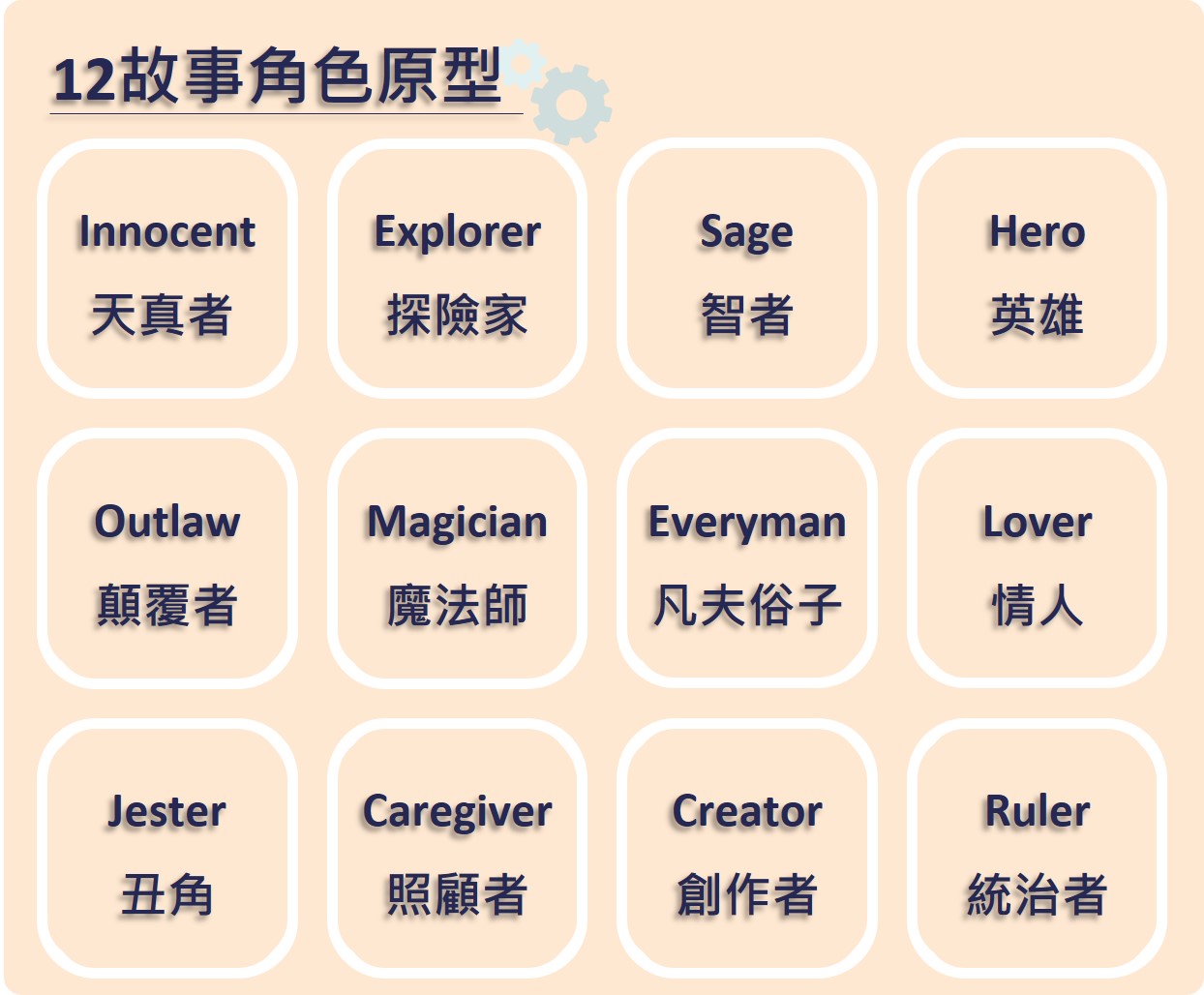 12 故事原型(Archtypes)為上世紀中是著名神話學大師坎伯提出,經過多年後由其弟子整理出的故事角色原型,這些原型影響後世甚深。1980 年代,喬治.盧卡斯利用 12故事角色原型,拍攝出膾炙人口的大片:「星際大戰」系列電影。而許多國際知名品牌,例如可口可樂、NIKE、香奈兒、哈雷機車、蘋果電腦…等,背後都有經典的原型支持著。