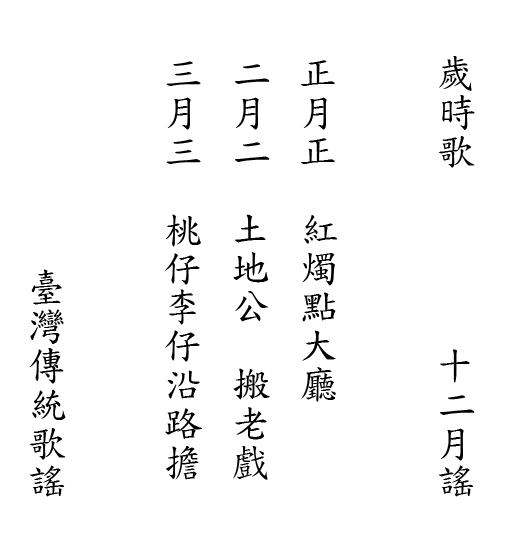 正月正,紅燭點大廳。二月二,土地公,搬大戲。三月三,桃仔李仔沿路擔。