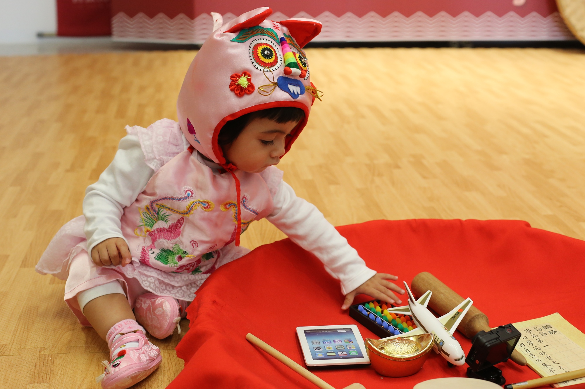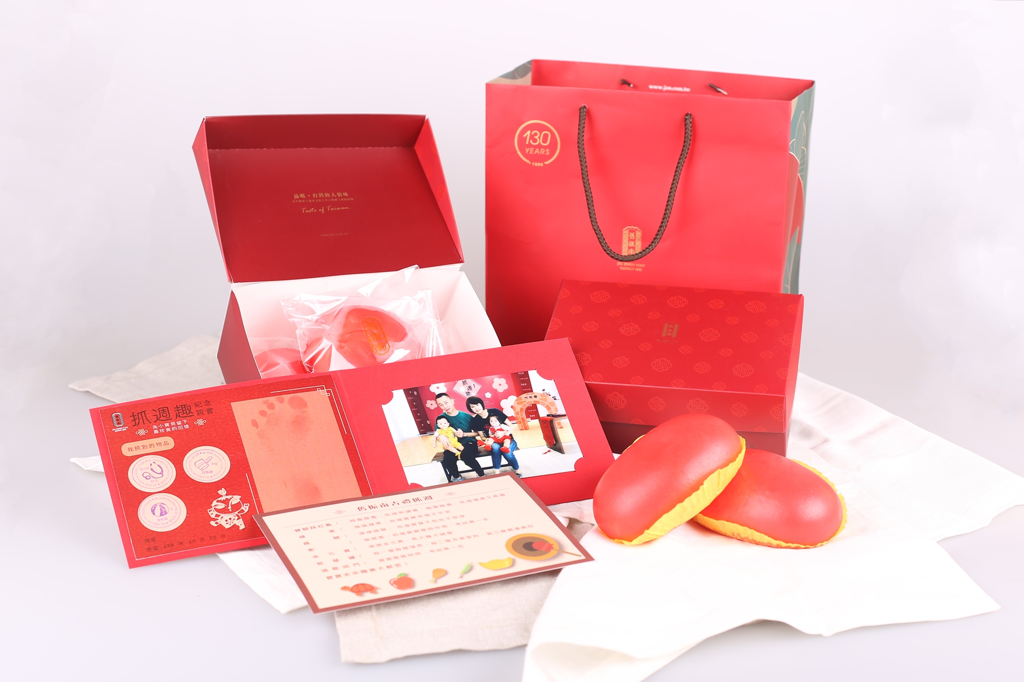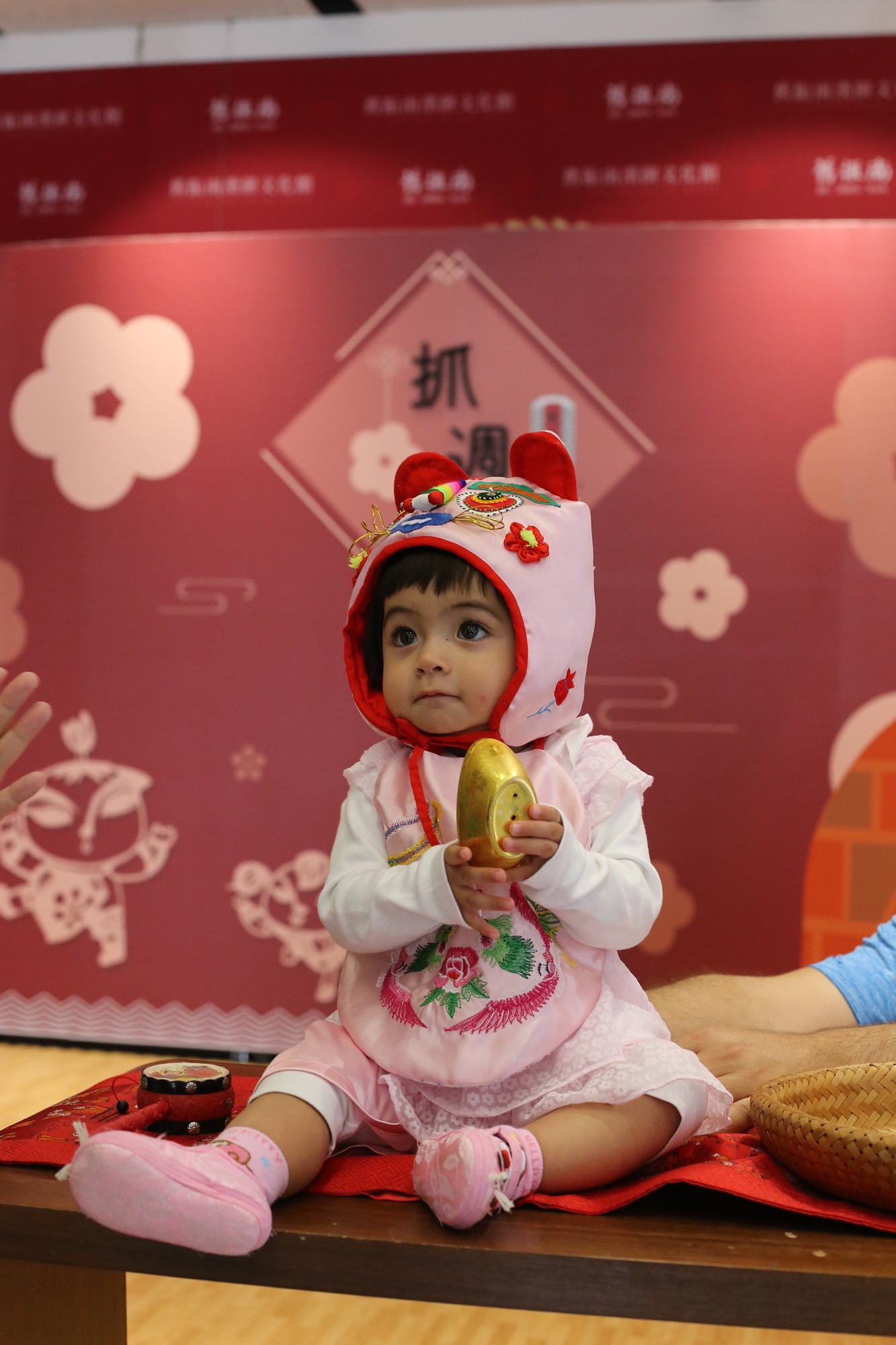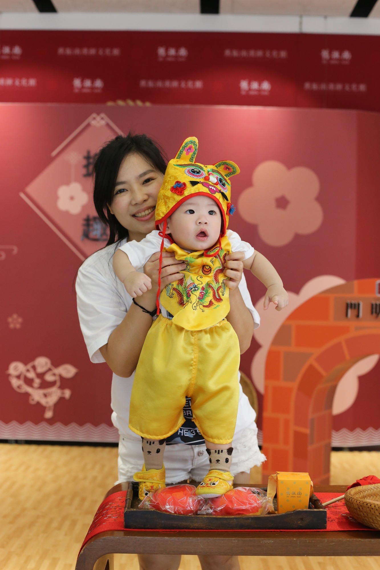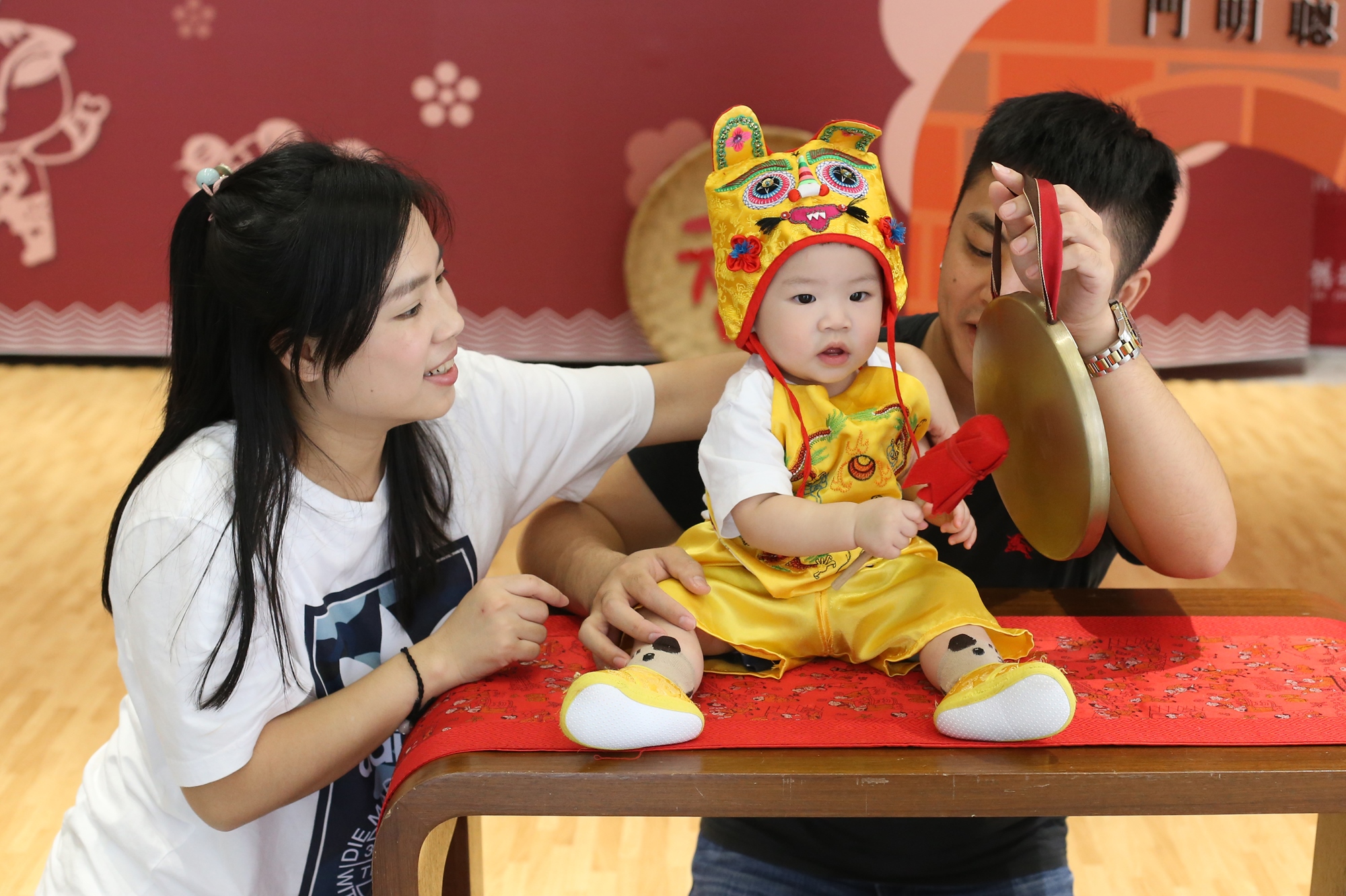 活動開始!讓寶寶雙腳各踏一個紅龜,期望孩子長命百歲、多福多壽。