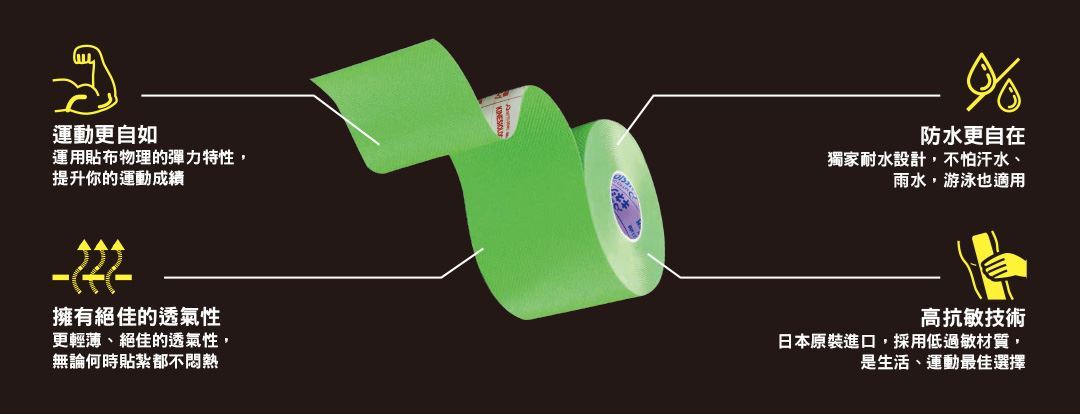 「肌內效」近年在臨床的應用上逐漸普及,在歐美等國際性的醫療體系,已成為最受醫生及物理治療師歡迎的治療輔助商品,更是提升病院患者生活及信賴度的利器。 本身不含任何藥物成分,利用貼布回縮現象產生物理作用,藉以模仿肌肉或筋膜用力,達到協助肌肉用力、減緩痠痛;提拉皮膚增加皮下組織空間、促進組織液流動,消除腫脹等功用。 肌內效貼布,由仿人體皮膚彈性纖維的棉織布、特殊凝膠及背紙組成;貼布背面波浪狀的紋路,是模仿人體的彈性纖維,可黏貼在人體上。