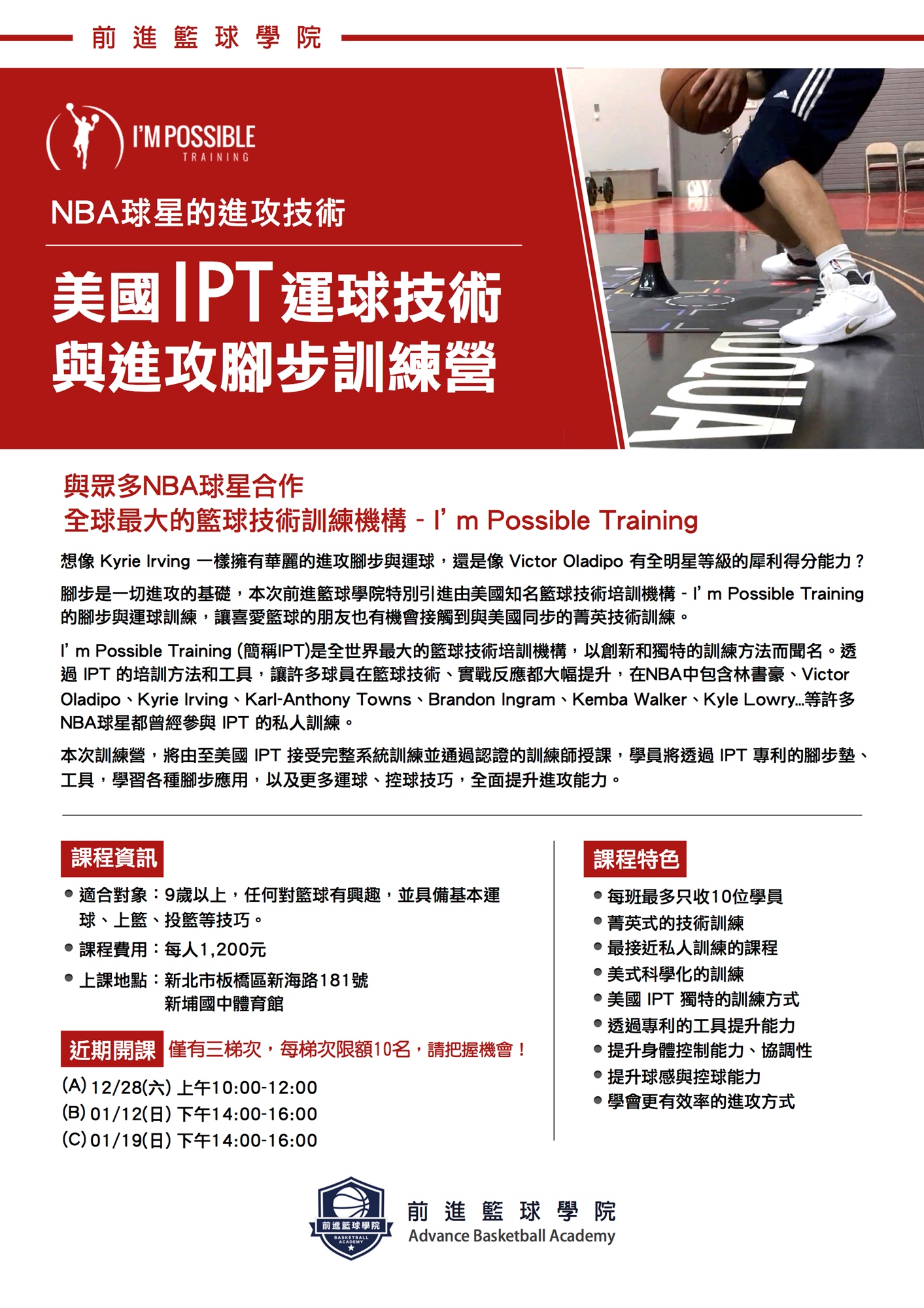 I’m Possible Training (簡稱IPT)是全世界最大的籃球技術培訓機構,以創新和獨特的訓練方法而聞名。透過 IPT 的培訓方法和工具,讓許多球員在籃球技術、實戰反應都大幅提升,在NBA中包含林書豪、Victor Oladipo、Kyrie Irving、Karl-Anthony Towns、Brandon Ingram、Kemba Walker、Kyle Lowry…等許多NBA球星都曾經參與 IPT 的私人訓練。