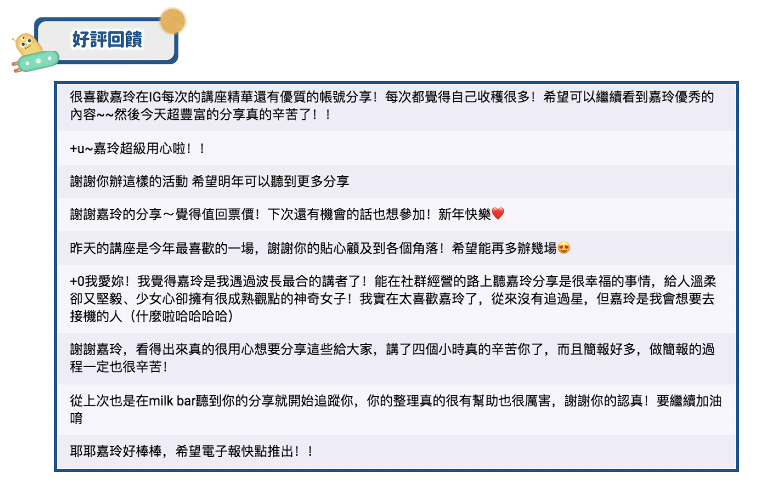❛ 今年六月嘉玲嘗試 IG 經營,每天在限時動態分享營銷新知整理,用五個月的時間,正式突破一萬追蹤者。