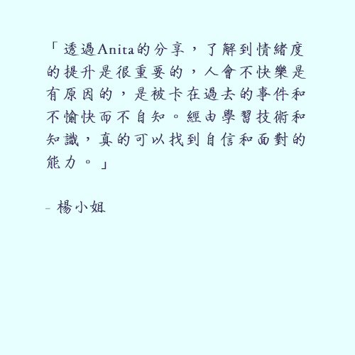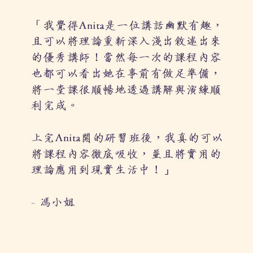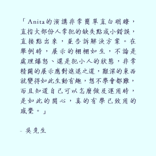 ➲ Anita企業教練,累積一對一諮商輔導超過數千小時,熱衷於知識培訓、人才養成、教練人們輕鬆運用所學、享受學習的樂趣,並進一步優化生活、工作與企業管理,已經協助超過千人,完成目標實現夢想。