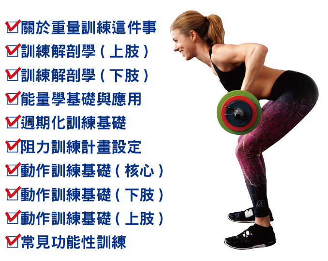 自由重量(Free Weight)訓練歷史悠久,而且變化多元,只要擁有適當的器材以及操作技巧,不僅可以組合出豐富的訓練內容,而且自由重量訓練對於身體的刺激與適應結果,可以為我們帶來許多健康的效益。相較於健身房盛行的今日,重量訓練常常被固定式訓練器材畫上等號,甚至是貼上「高門檻」與「高風險」的標籤而被束之高閣。本堂課程的內容在於讓各位參與學員能更全面的了解何謂「自由重量」,並如何安排訓練計畫與應用。