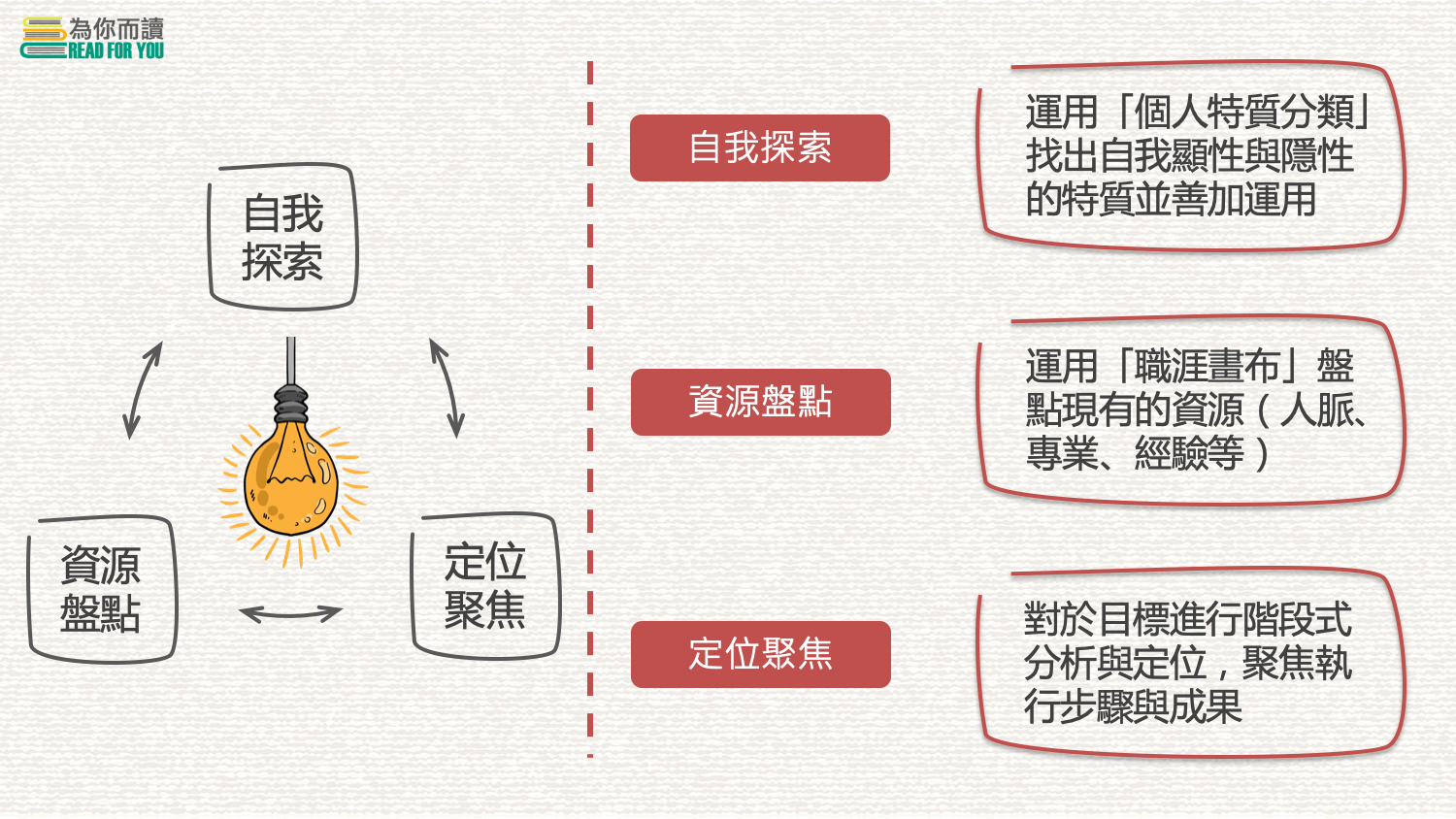你我皆知「工作」占人生近3分之1的時間!也許你會覺得,不過只是3分之1,但事實上,如果不是咬著金湯匙出生的人,工作的好壞與高低,影響著可能是5分之4的人生。因此,「職涯盤點術」絕對是你我必懂必學必會的人生必修課。