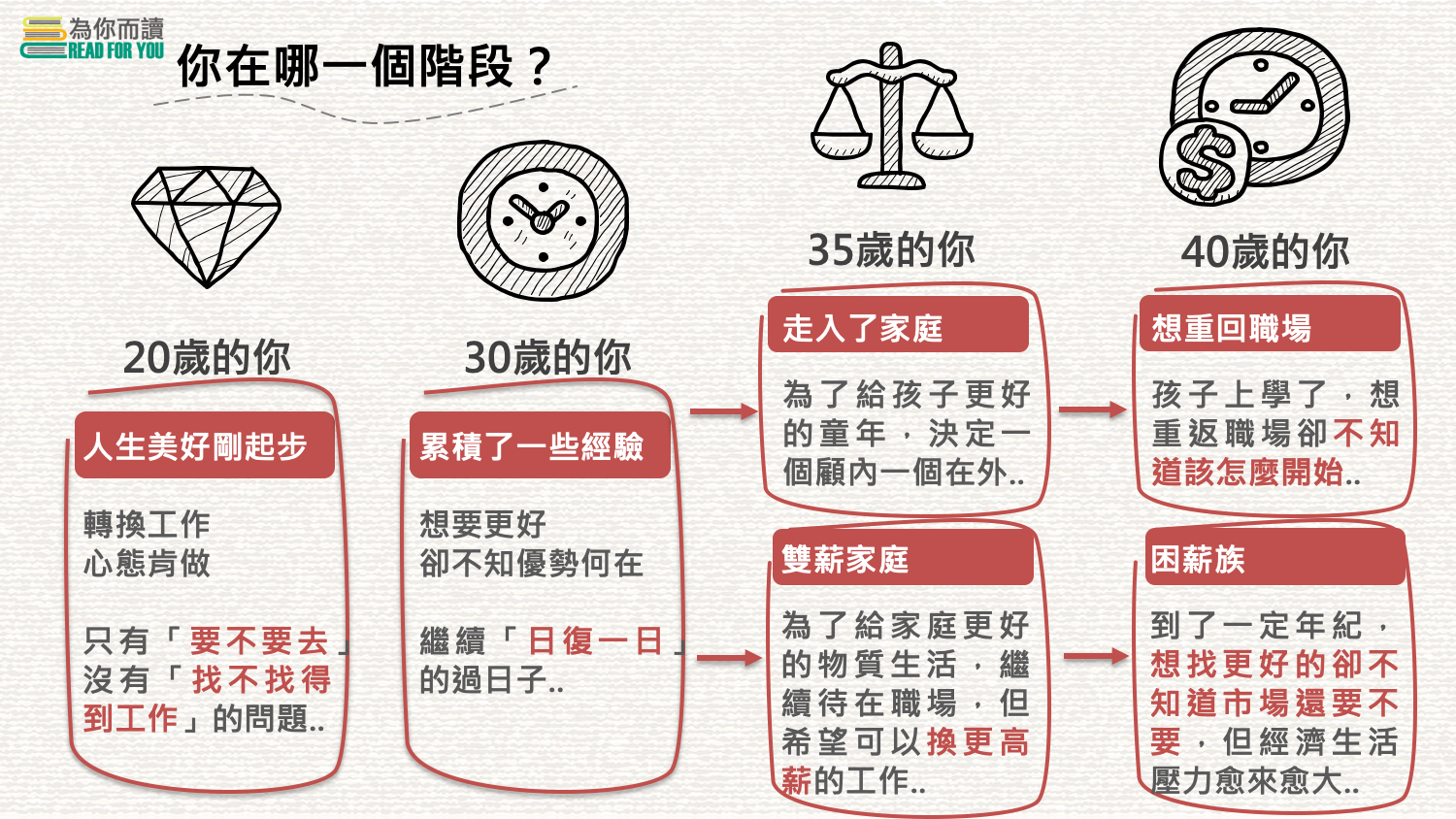 ➤走往職業爸or媽的你,隨著責任變重物價上漲,已經感受到呼吸的困難,想要找尋更好的機會卻不敢隨意亂換工作。一來是因為不知道自己的競爭力在哪;二來是生活壓力經不起隨意的動盪。