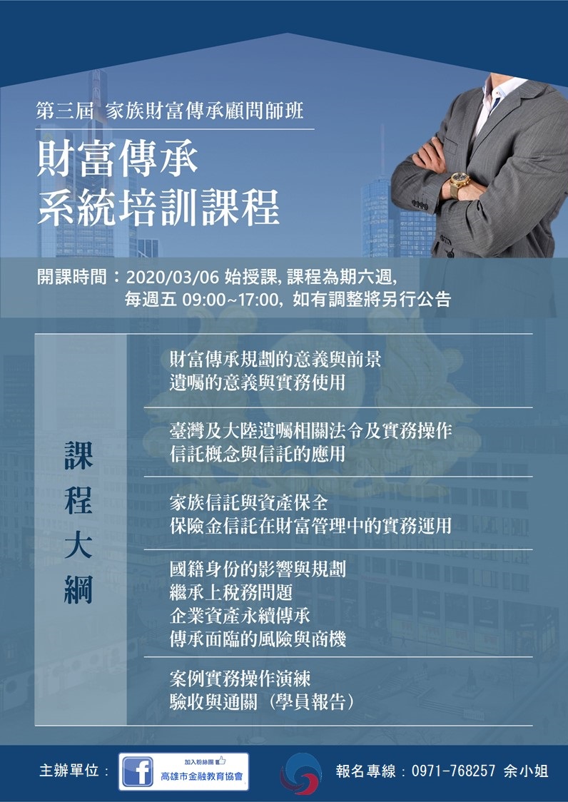 本課程主要針對在私人財富管理領域內,協助規劃家族財富的保全與傳承。