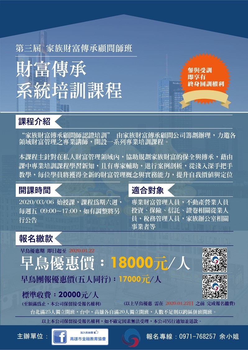 適合對象:專業財富管理人員,不動產營業人員,投資、保險、信託、證券相關從業人員,稅務管理人員,家族辦公室相關事業者,金融理財業務,以及有志從事高資產客戶財富管理者。