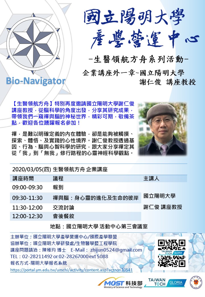 【生醫領航方舟】特別再度邀請國立陽明大學謝仁俊 講座教授,從腦科學的角度出發,分享其研究成果,帶領我們一窺禪與腦的神秘世界,精彩可期,敬備茶點,歡迎各位踴躍報名參加!