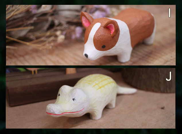A.穿山甲、B.刺蝟、C.河馬、D.犀牛、E.大象、F.貓熊、G.黑熊、H.小豬 I.鱷魚 J.柯基犬K.貓咪 L.狐狸