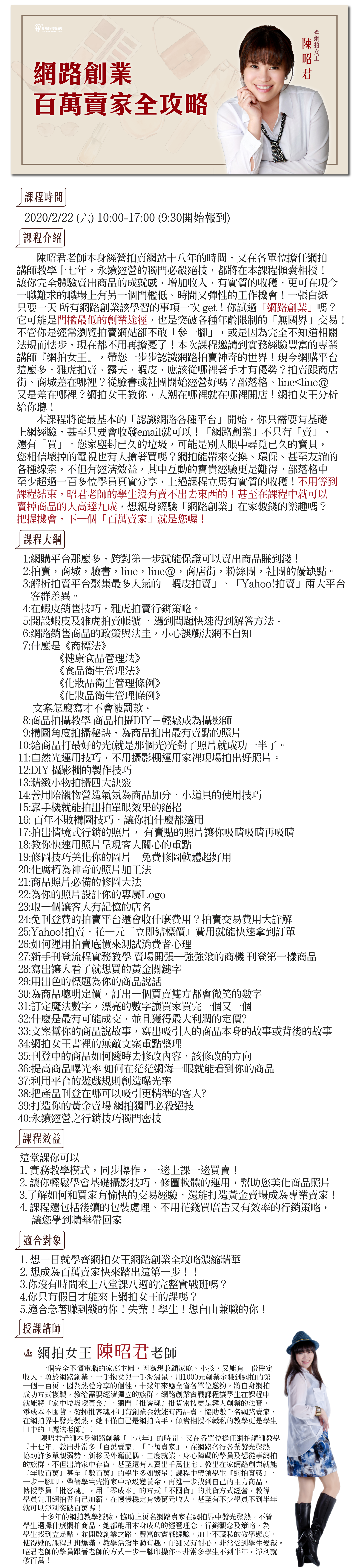 2/22 網拍女王 陳昭君 網路創業🔥百萬賣家全攻略(假日班)