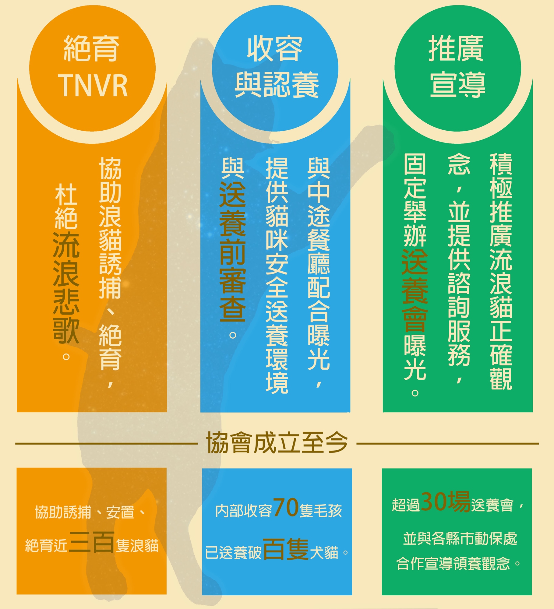 在這條幫助貓咪中途的路上,我們接過了許多的中途案例,被母貓遺棄的小奶貓們、因家裡有人懷孕需要接手中途的貓、被社區鄰居舉報的浪貓、受虐待的街貓、需要出國工作交至協會照顧的老貓、收容所沒人認養的孩子、中途愛媽救援回來的毛孩等等,每一隻在協會中我們都用心記住每隻貓咪的面貌。