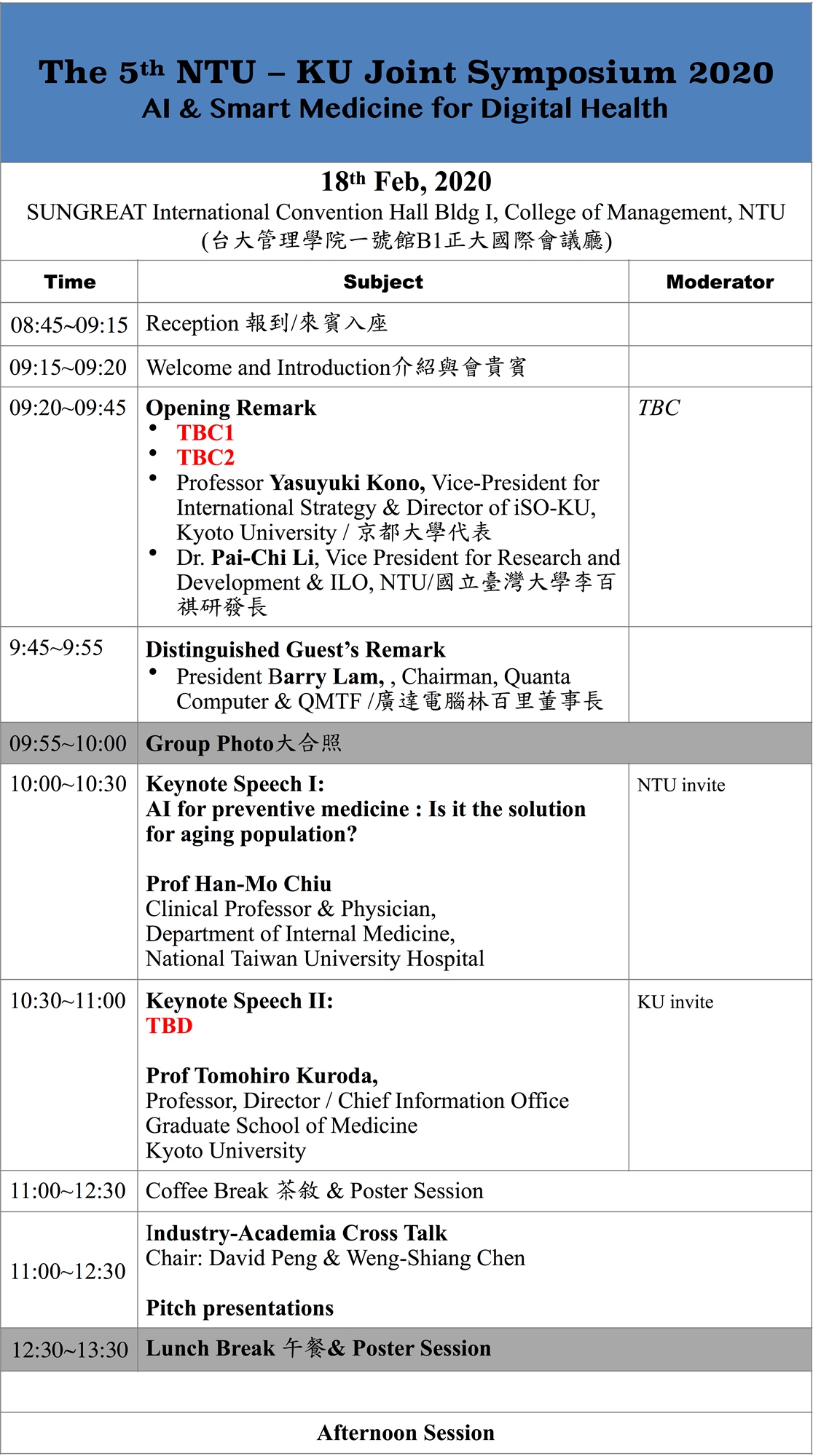 國立臺灣大學和京都大學共同在台舉行第五屆數位健康研討會 (The 5th NTU-KU Joint Symposium on Digital Health),論壇邀請雙方大學知名專家學者一同探討人工智慧 (A.I.) 在預防醫學、診斷、臨床治療、健康促進上的最新技術發展,以及未來應用可能性。並同時邀請到廣達電腦林百里董事長出席,為大會進行特別演講:由 ICT 廠跨足到生醫領域的角度來頗析人工智慧 (A.I.) 技術的發展會帶給生醫產業哪方面爆炸性的成長。